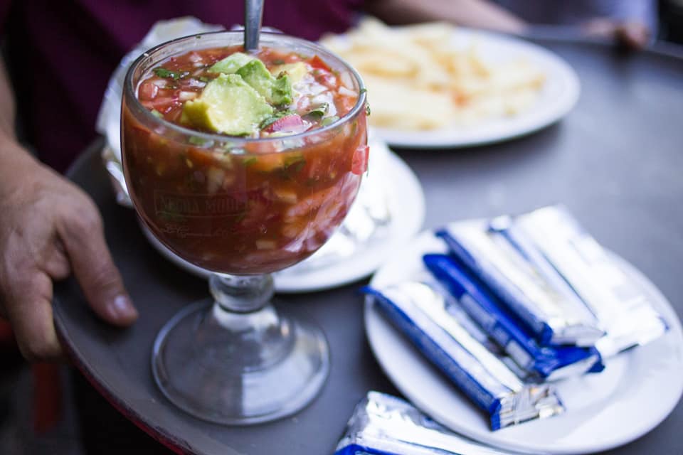 200gr, camarón con pepino en salsa de chile serrano, cebolla morada y jugo de limón, con papas fritas.