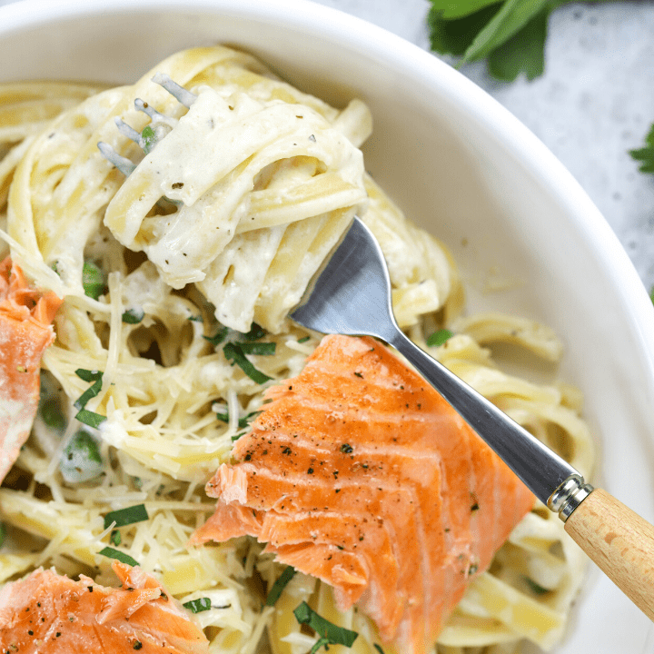 Pasta estilo fettuccine, crema, queso parmesano rayado y salmón.