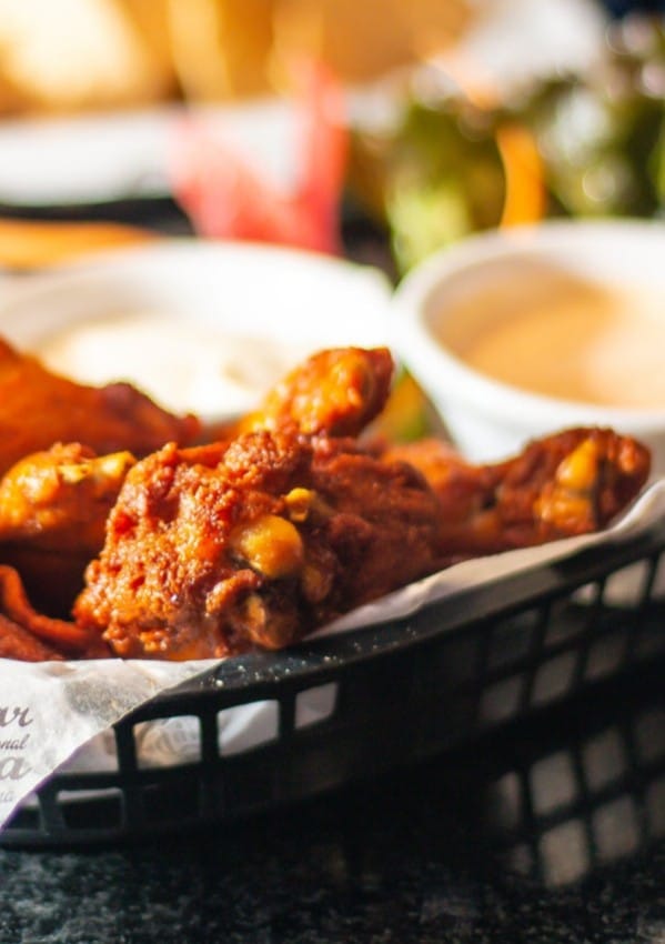 Alitas de pollo fritas con aderezo de chimichurri y salsa Ranch.