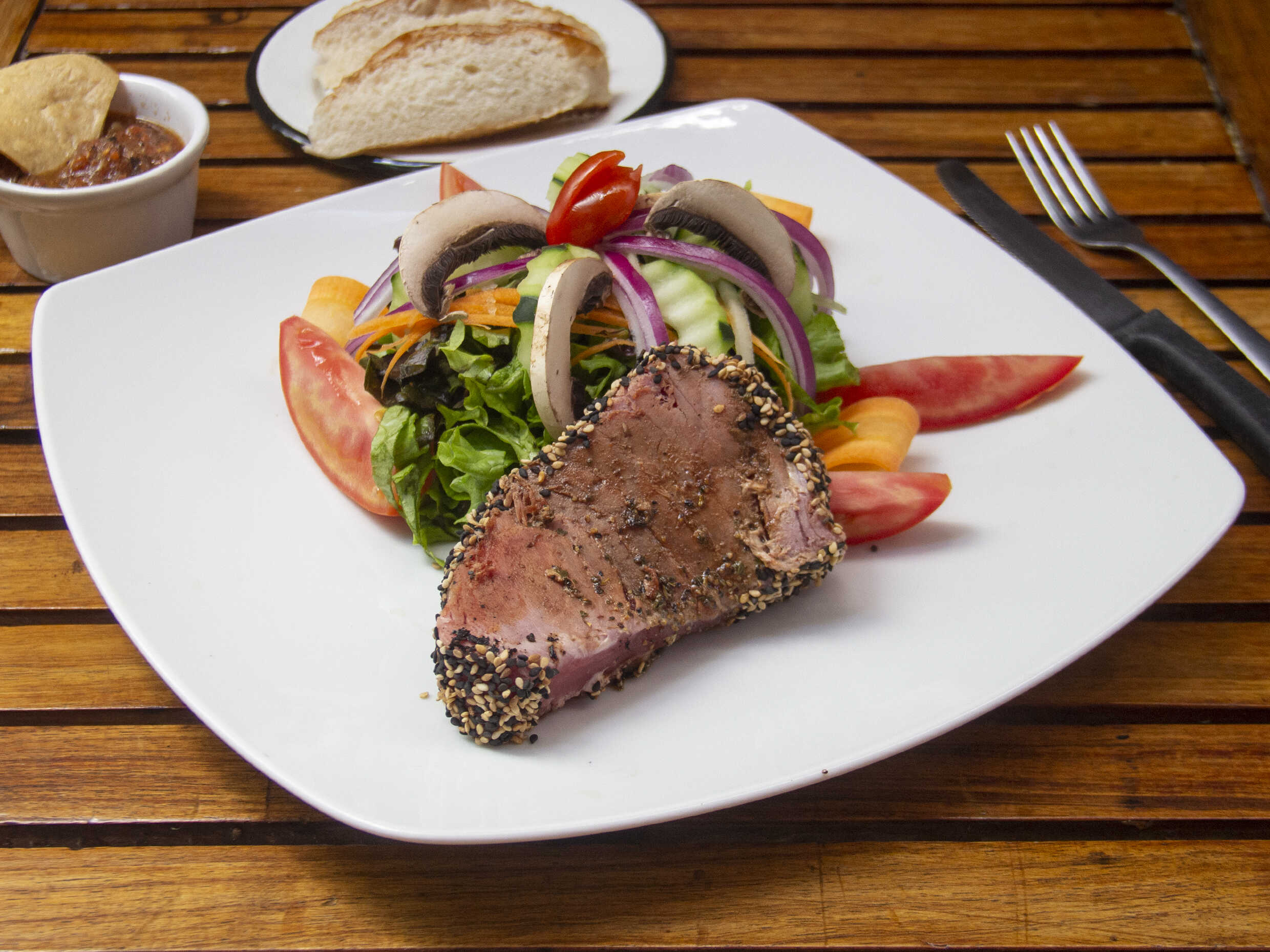 Lonja de atún sellado a la plancha y acompañado de ensalada.