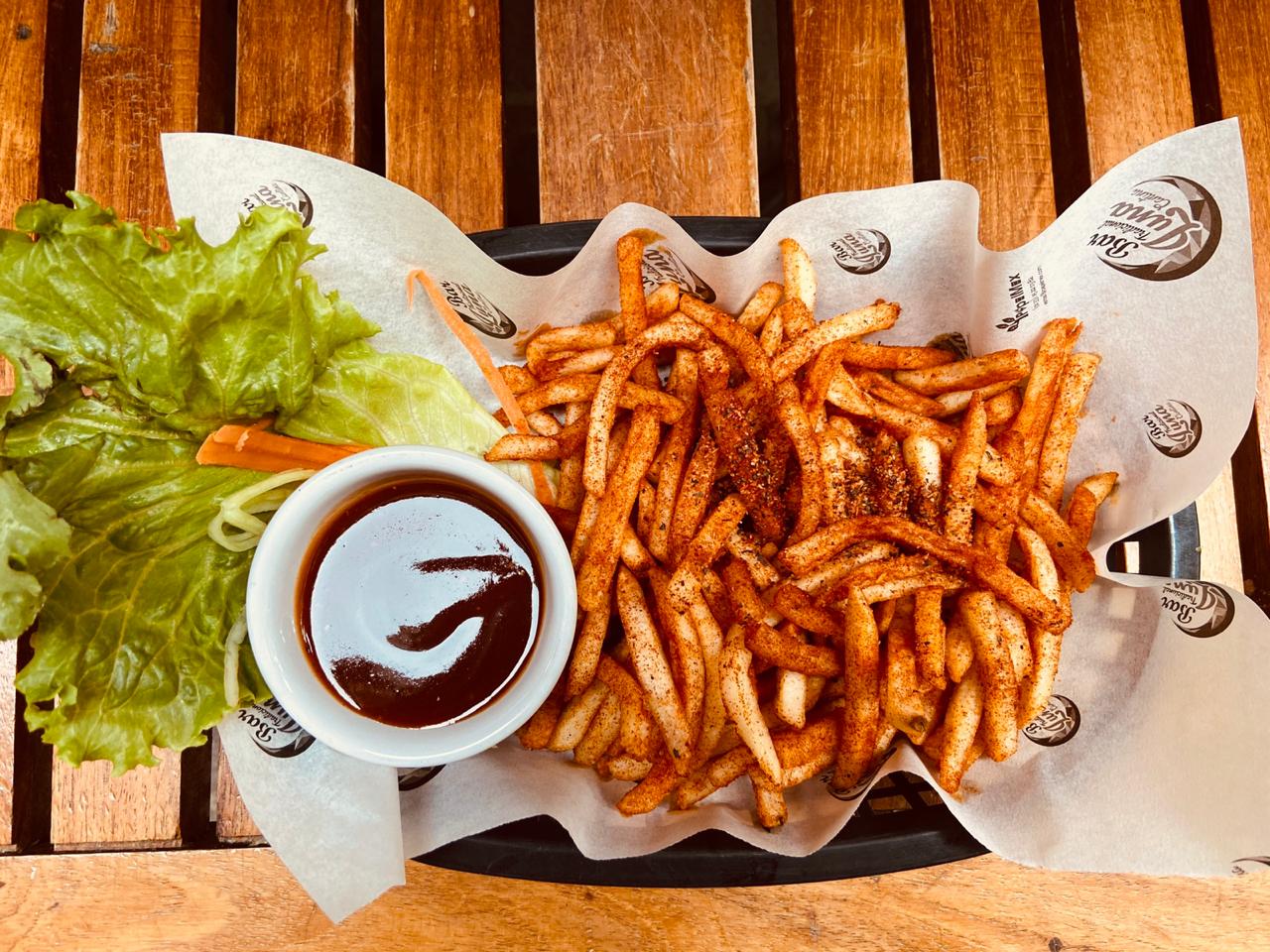 Papas fritas acompañadas de chimichurri y salsa catsup.