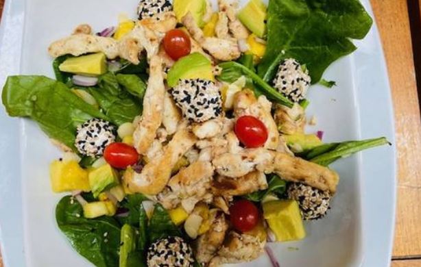 Mezcla de espinaca, jitomates cherry, aguacate, chiles, cebolla morada, queso de cabra, vinagre balsámico y proteína a elegir.