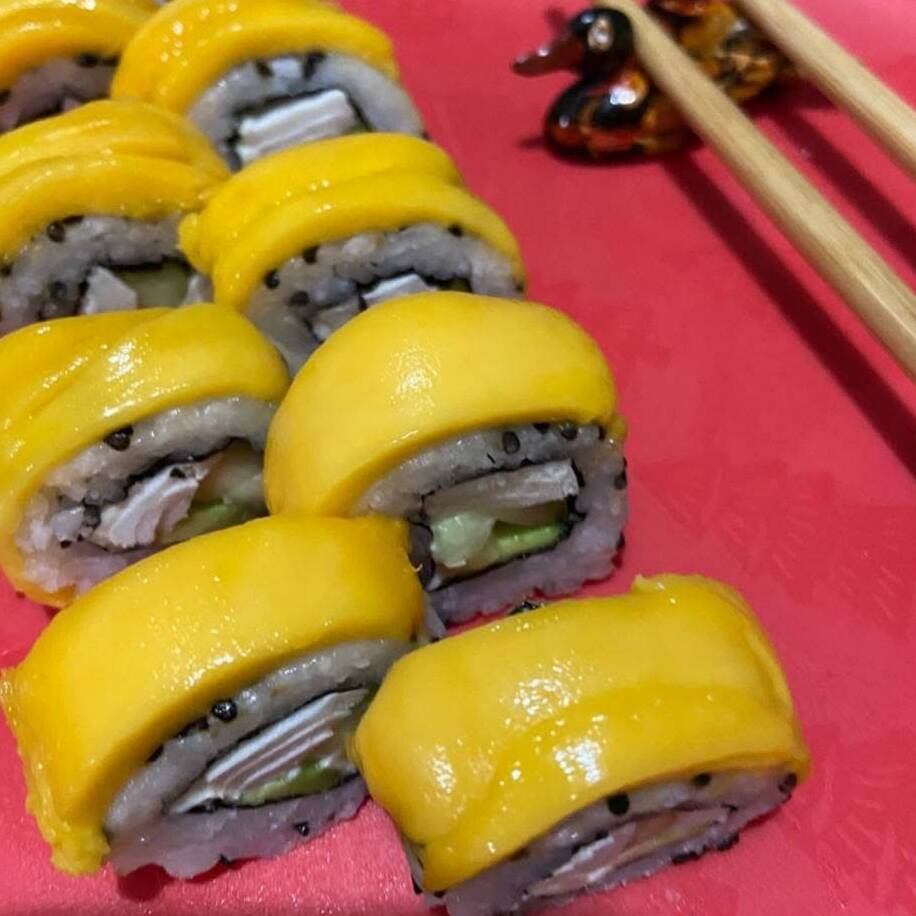 Cangrejo tempura, aguacate, Queso crema, envuelto en mango.