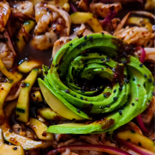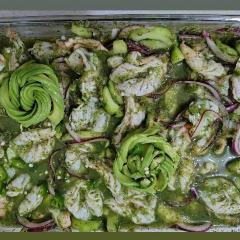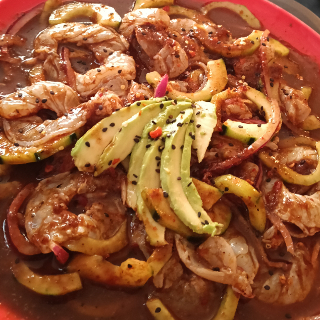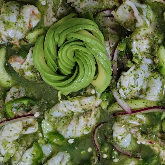 Camarón encurtido, bañado en salsas especiales, cebolla, pepino y aguacate todo fresco y echo en el momento (2 personas)