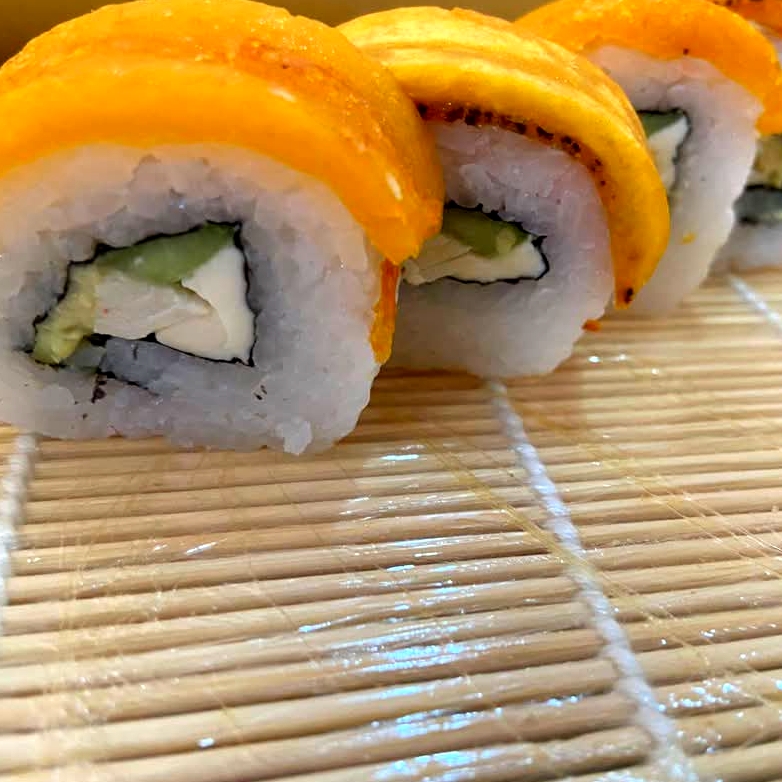 Envuelto en plátano frito Relleno:Nori, Queso crema, aguacate, Zanahoria, cangrejo tempura.