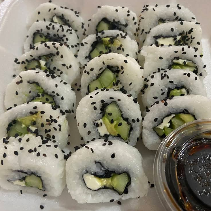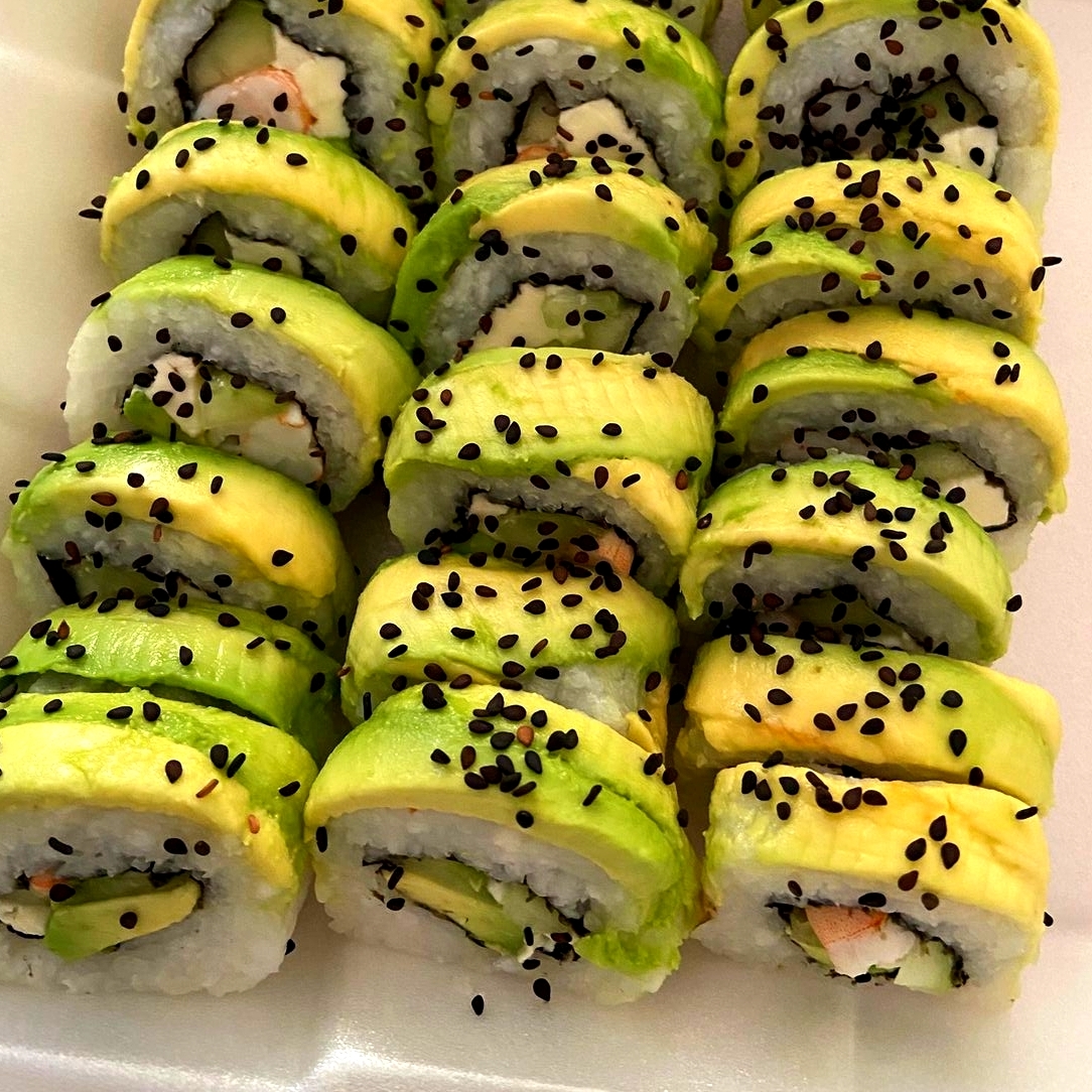 Camaron, aguacate, pepino, queso crema. Por fuera Aguacate y semilla de sesamo.