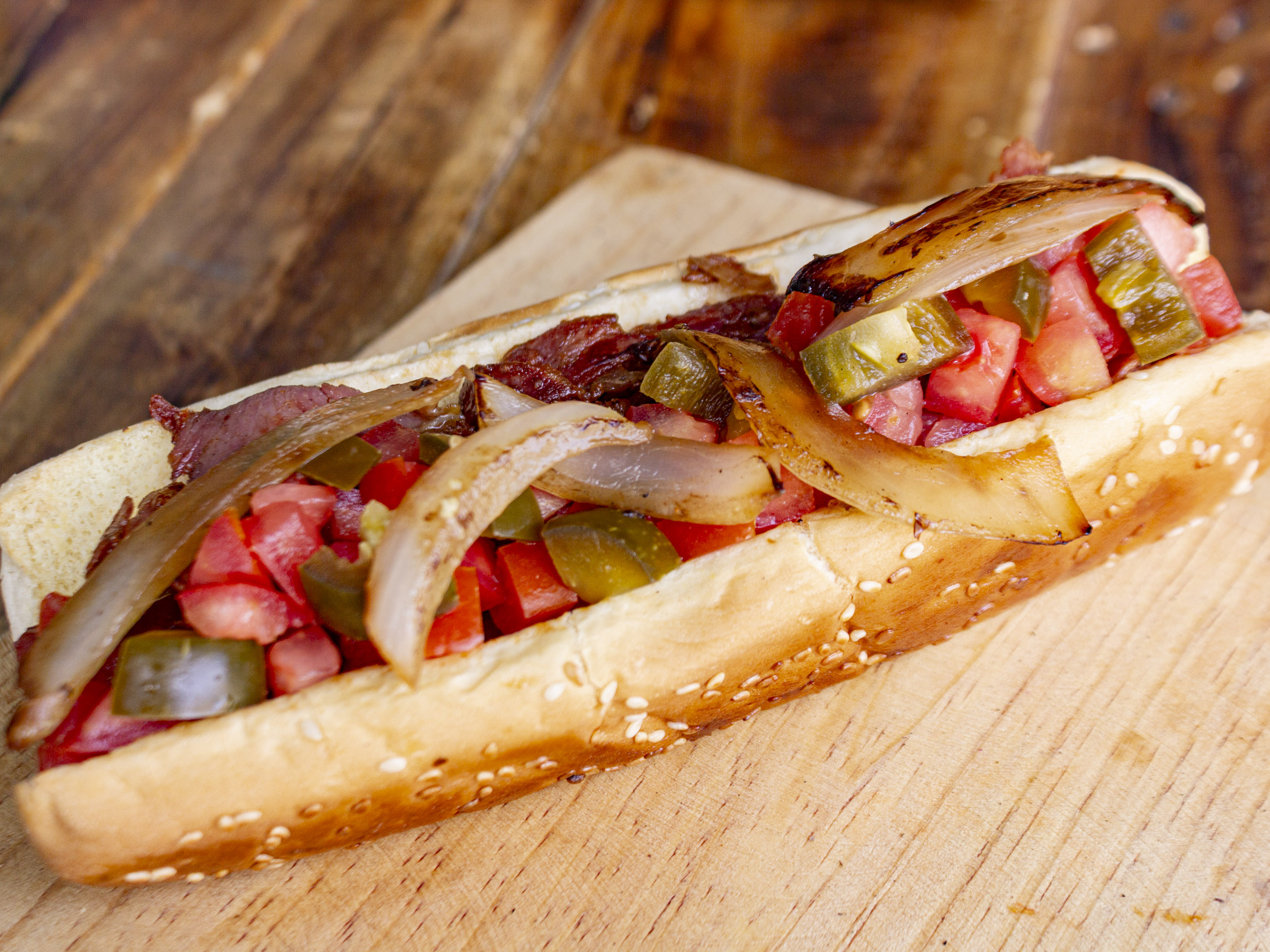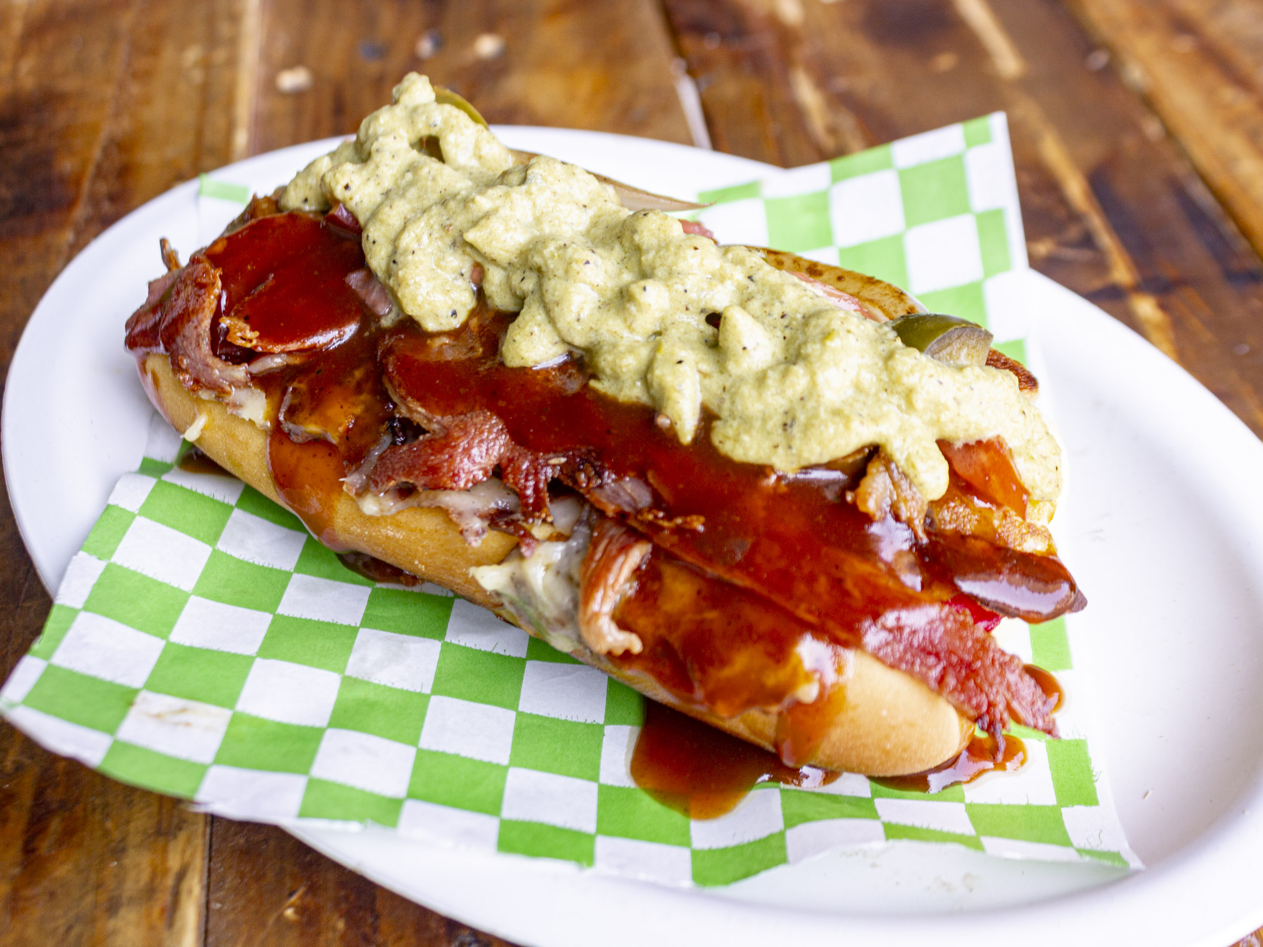 Salchicha para asar, queso asadero, tocino, BBQ, aderezo jalapeño y verdura.