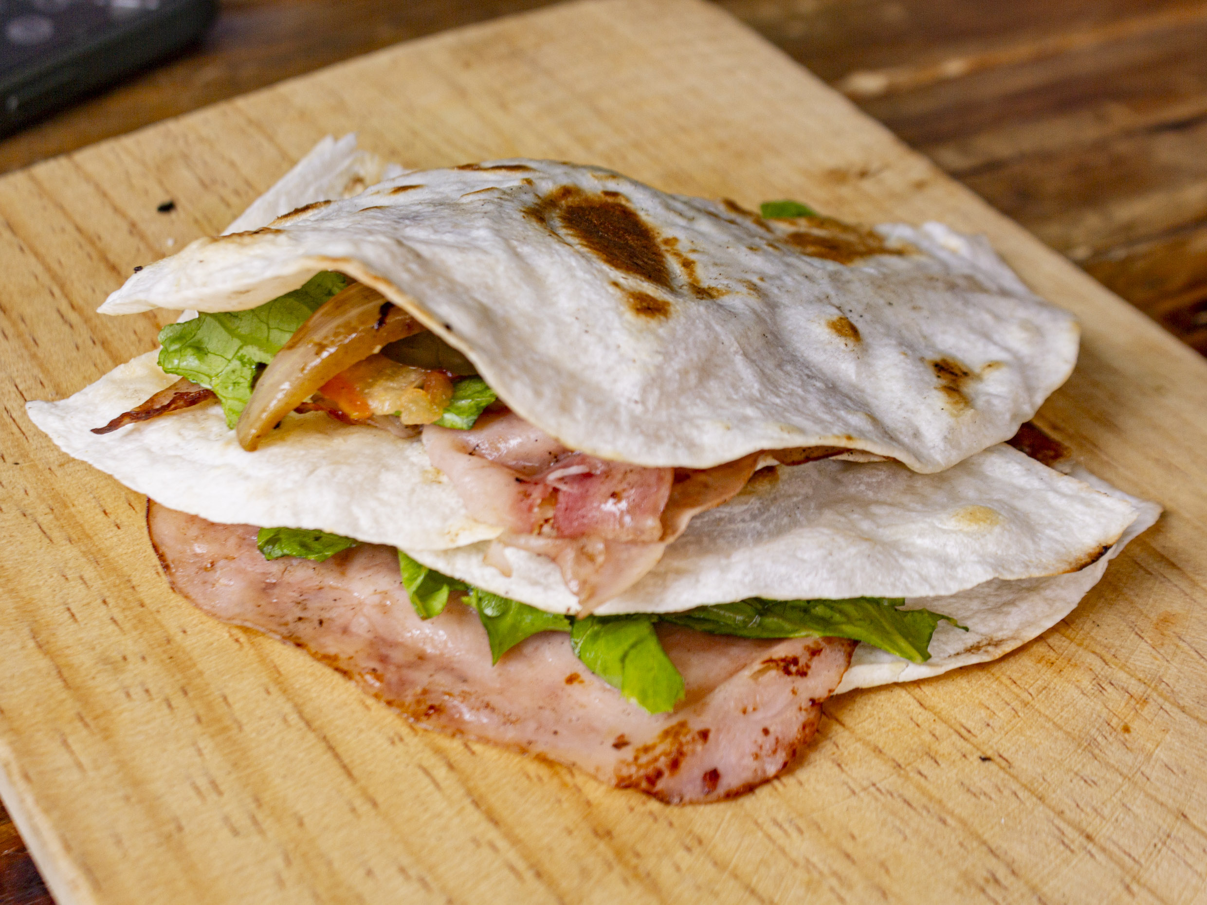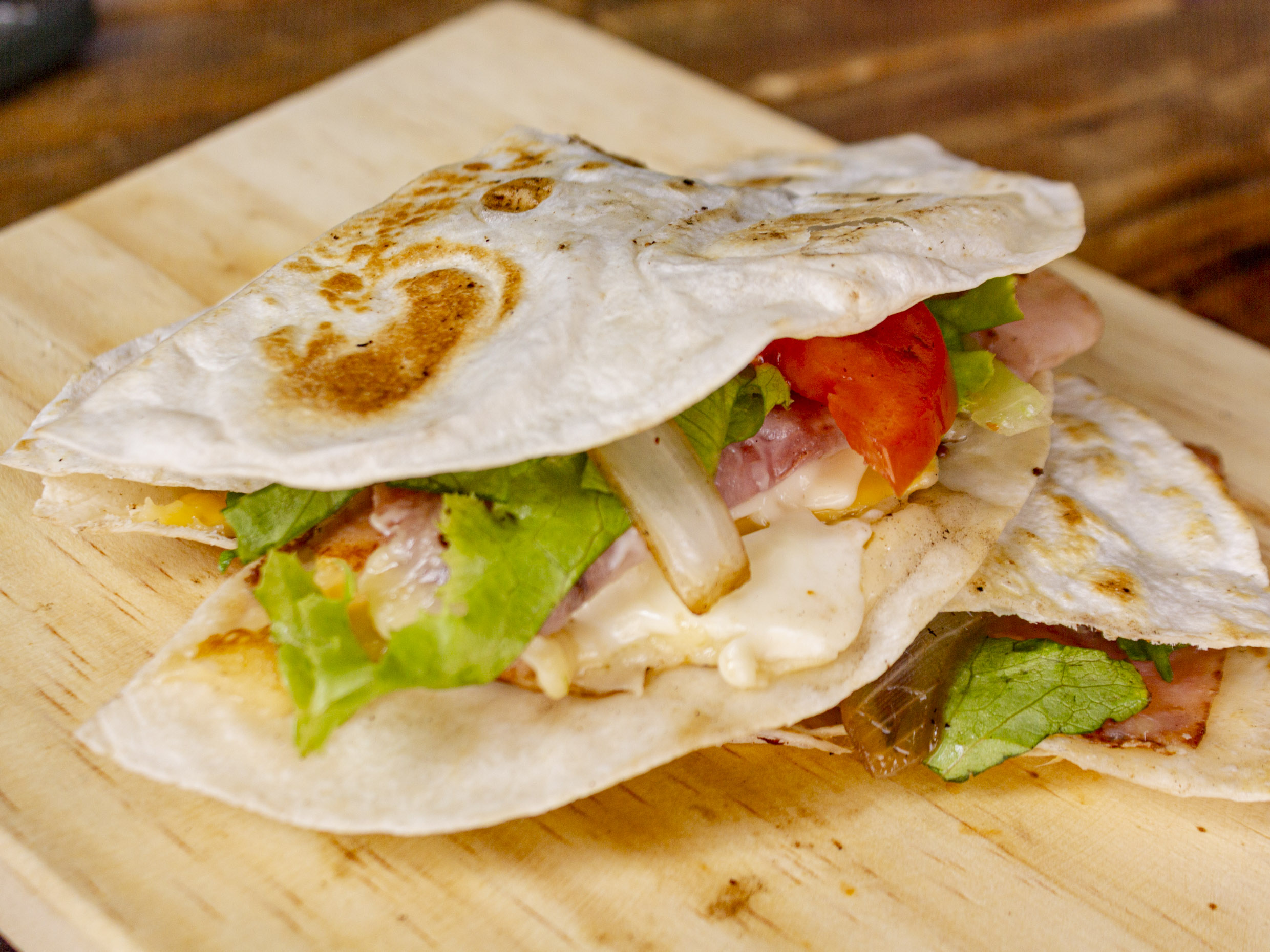 Doble tortilla de harina, queso asadero, queso amarillo, queso crema y jamon.