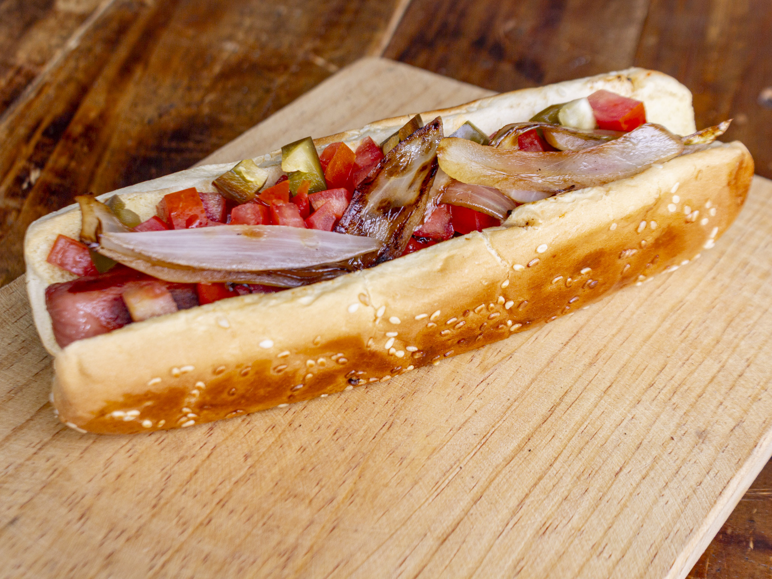 Salchicha, queso asadero, salsa de tomate, pepperoni y verdura.