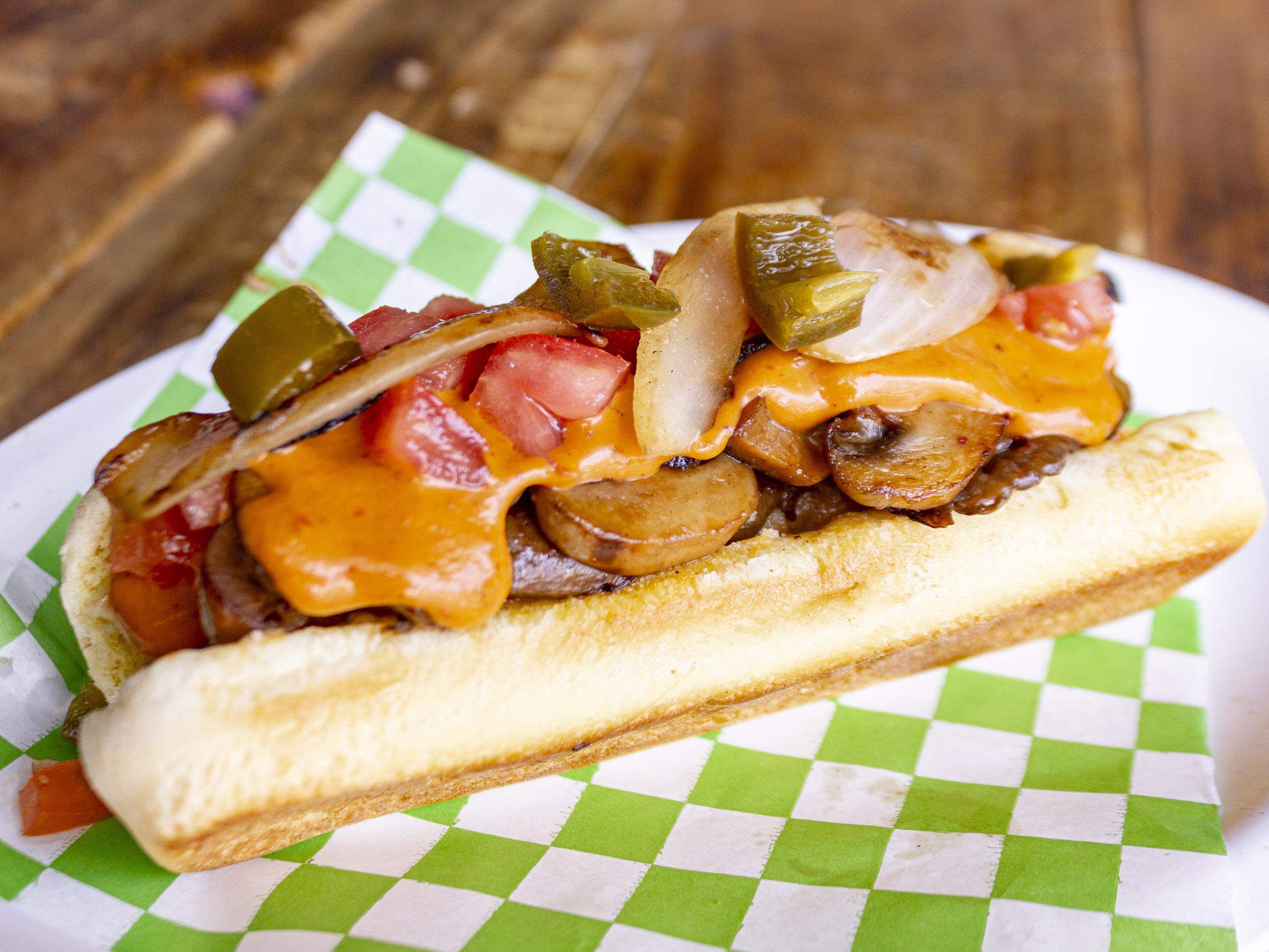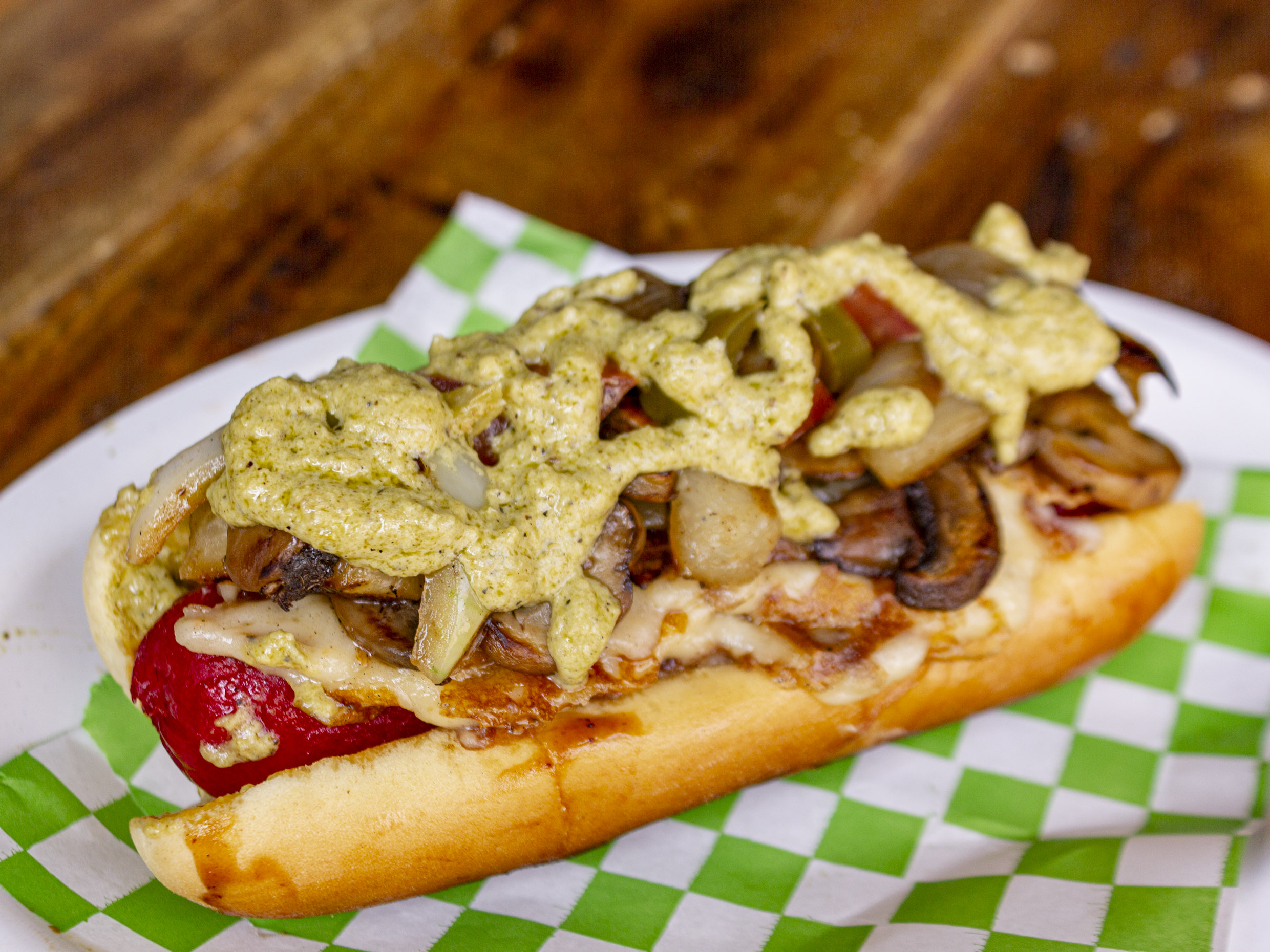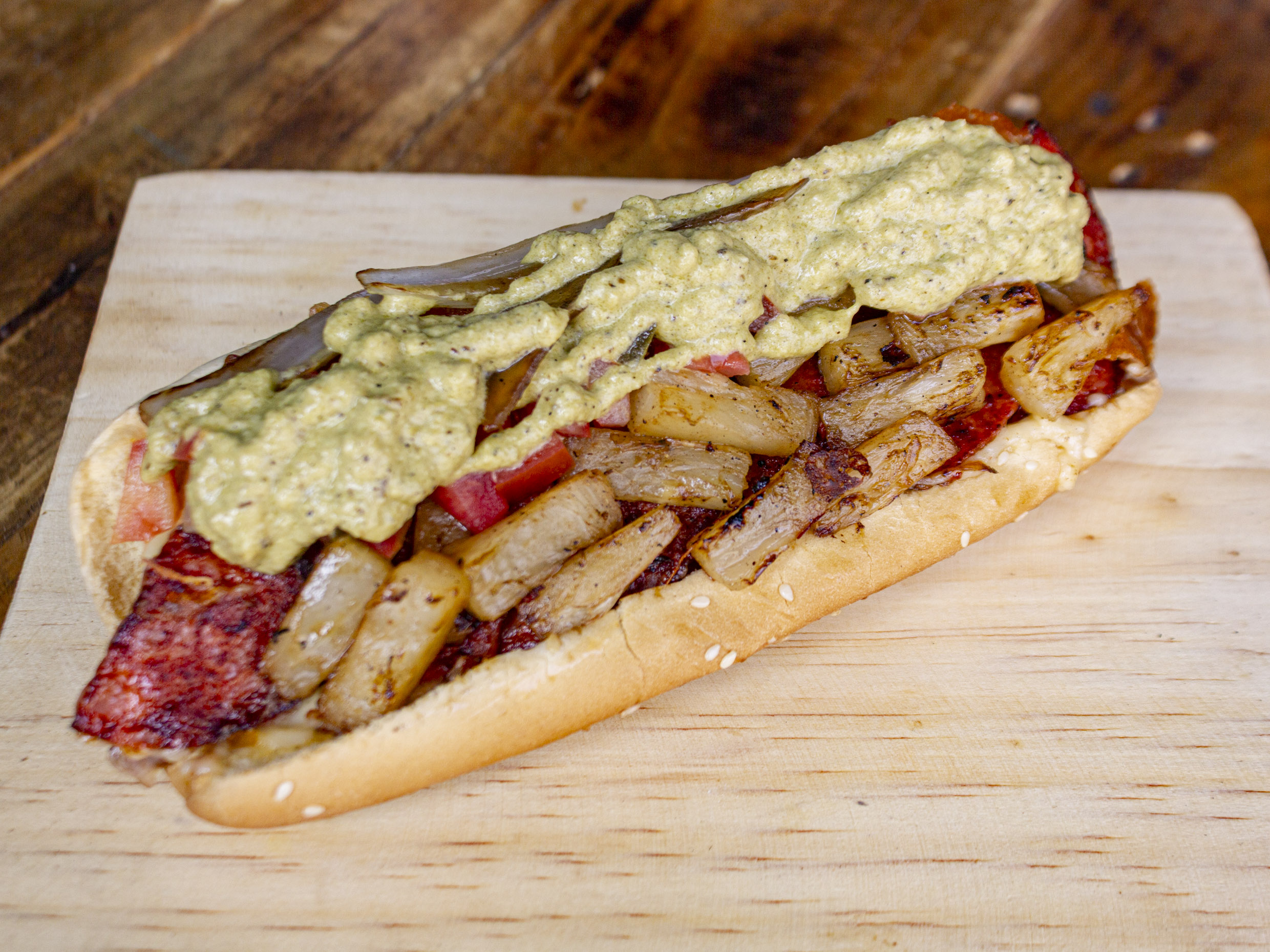 Salchicha, queso asadero, champiñón, aderezo chipotle y verdura.