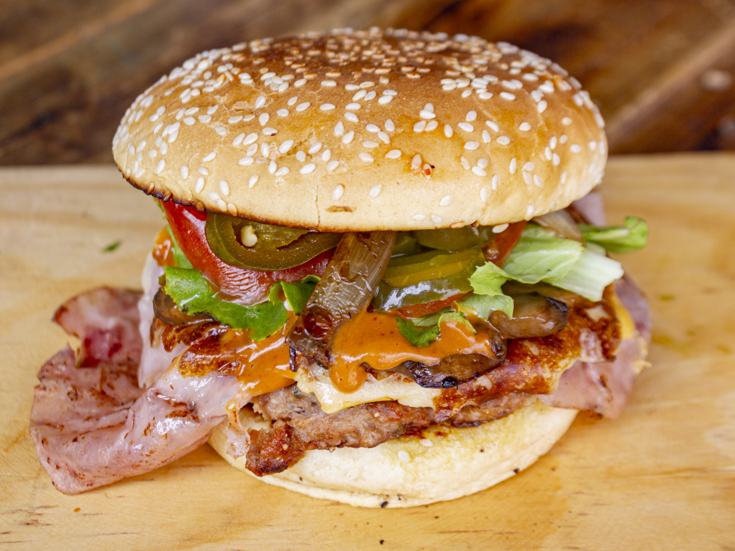 Carne, queso amarillo, queso asadero, jamón y aderezo chipotle.