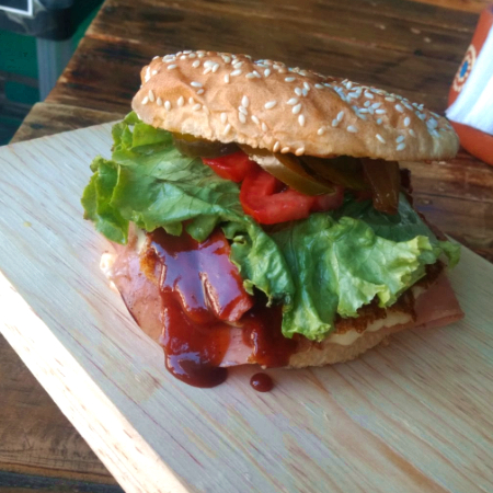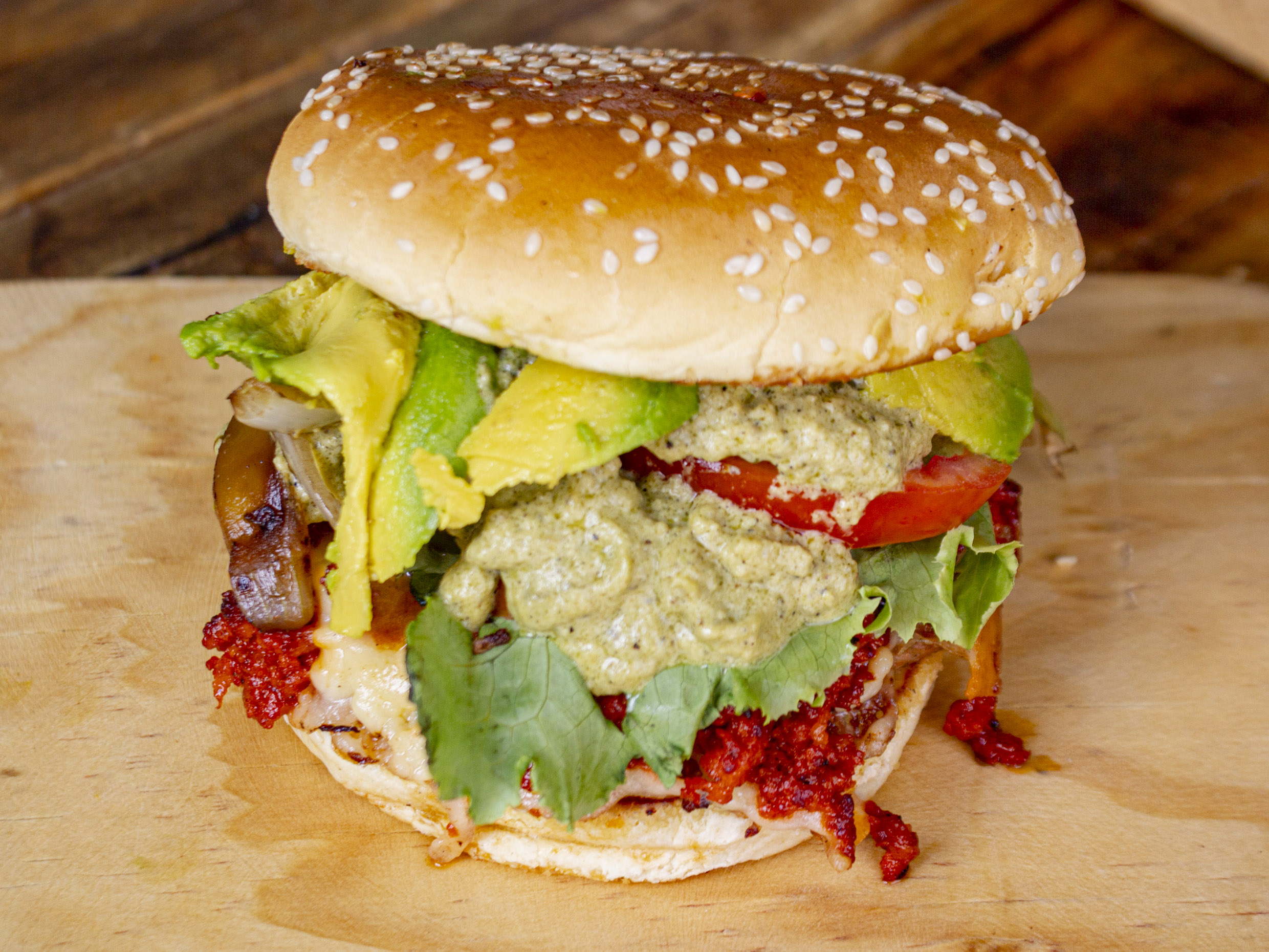 Carne de hamburguesa de pollo, lechuga, zanahoria, jitomate y aderezo ranch.