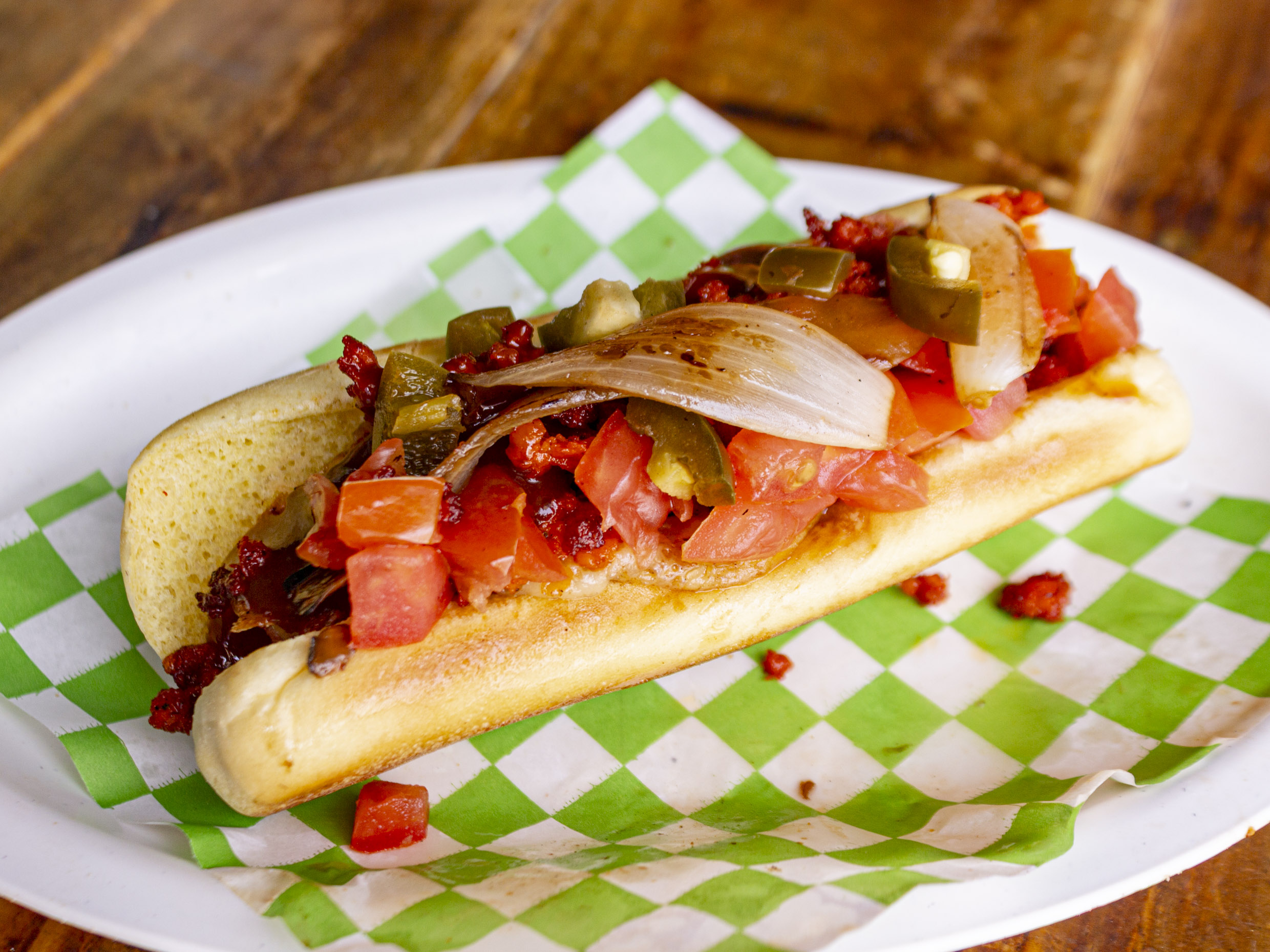 Salchicha, queso asadero, pastor, piña, aderezo jalapeño y verdura.
