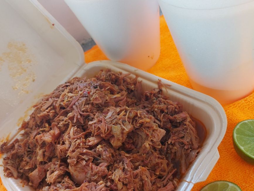 Medio kilo de birria, consomé, tortillas, verdura, salsas a su elección y chiles de la casa.