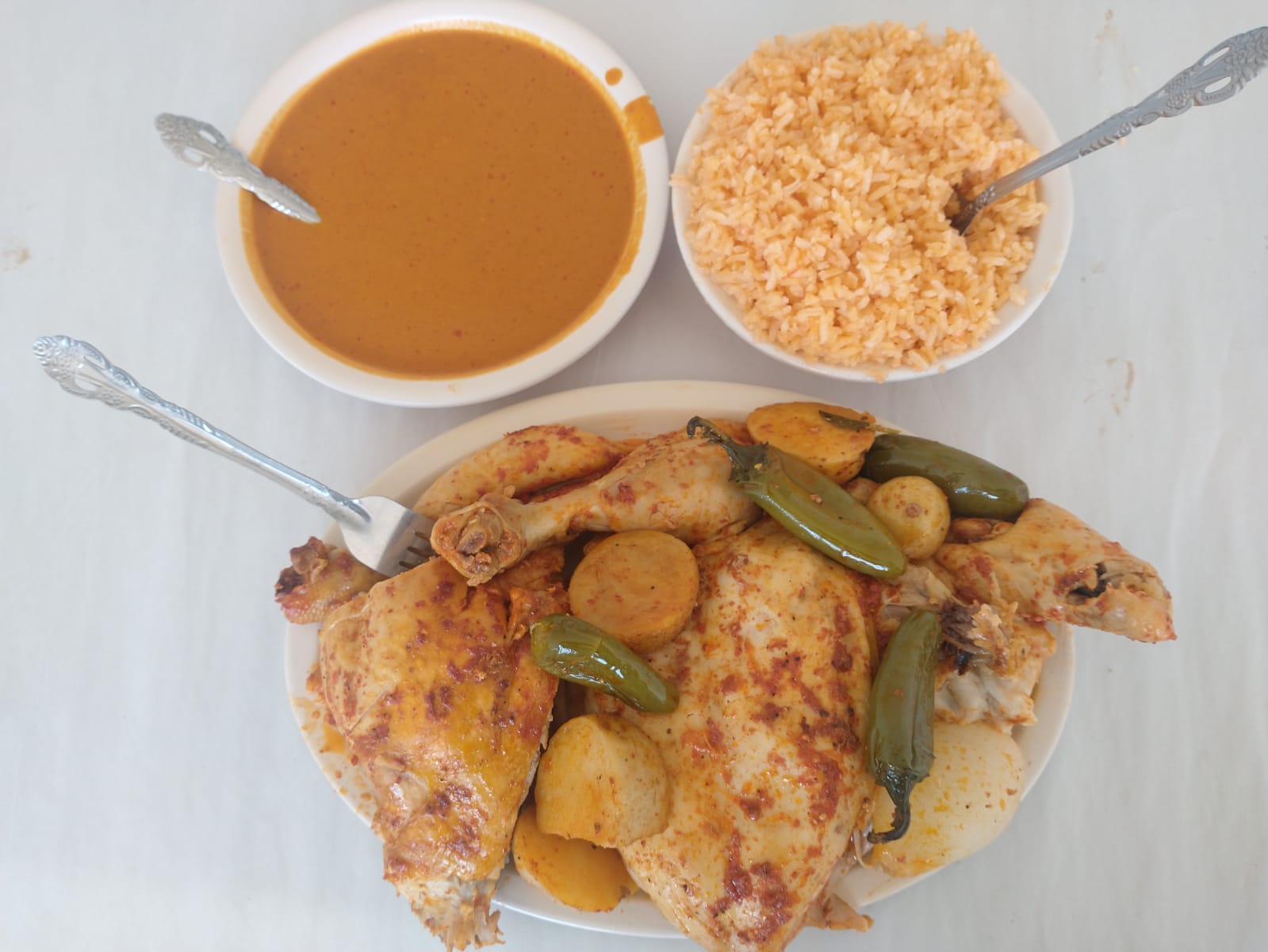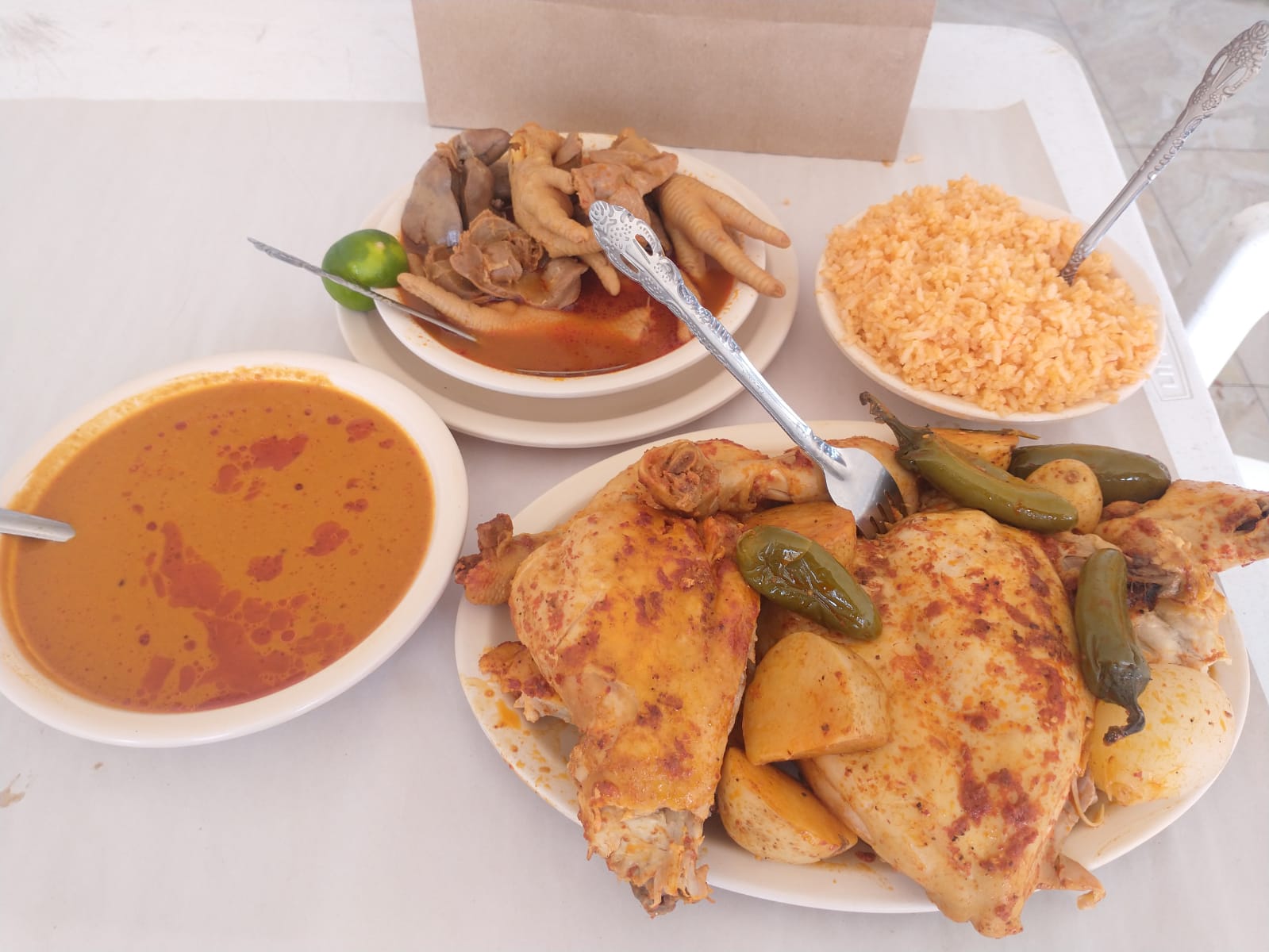 Incluye sopa de arroz, papas y chiles