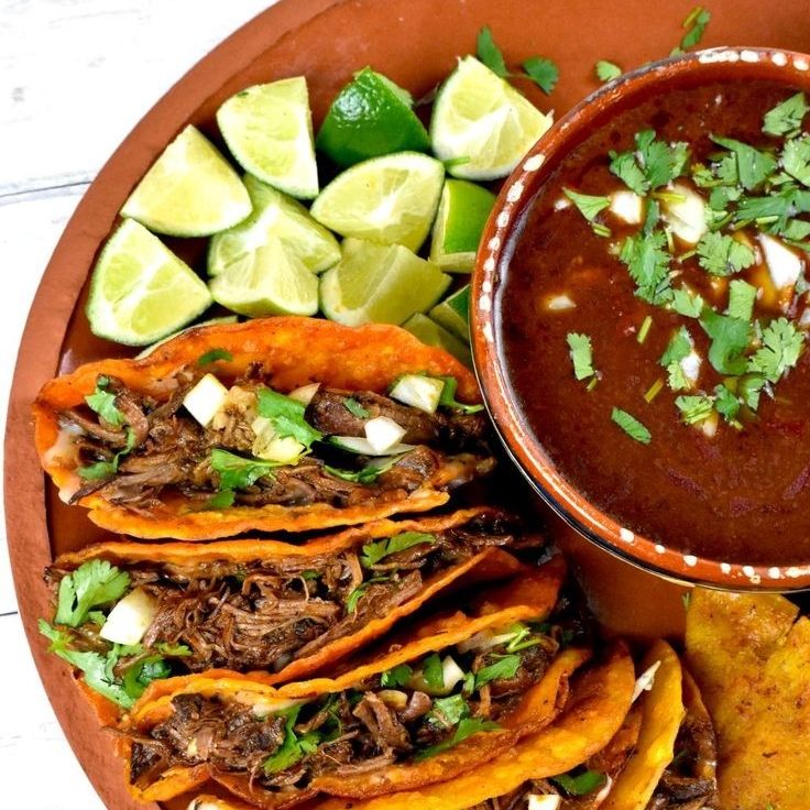 1 Litro de consomé, 150 gr de carne, cebolla y cilantro, limones, salsas a su elección y tortillas.