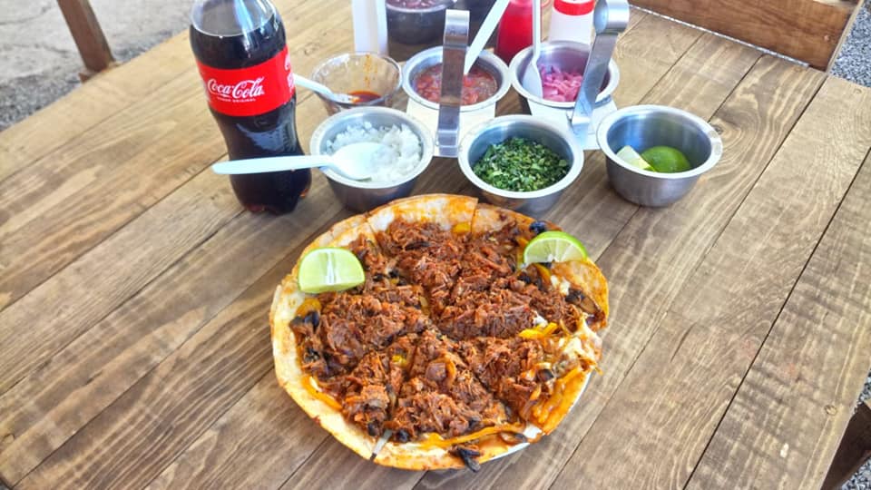 Base tortilla de harina con queso cubierta de birria con cebolla asada y champiñones