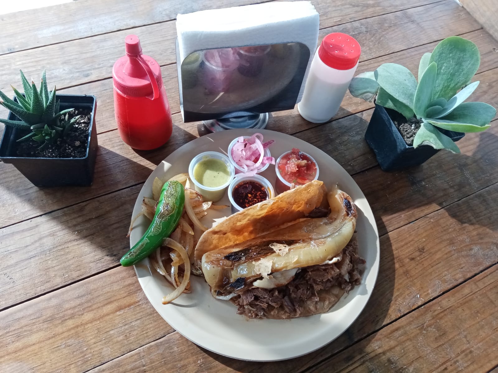 Tortilla de maiz doble relleno de birria, vegetales y salsas por separado. Por unidad