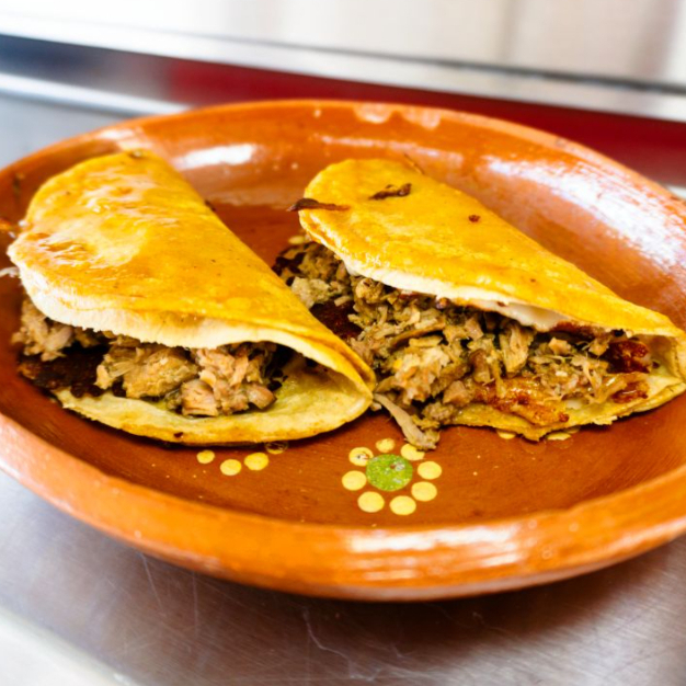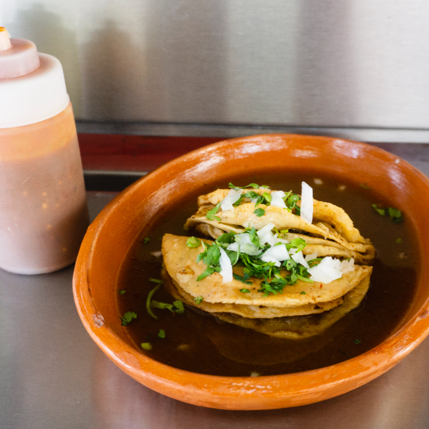 Quesadilla frita de maíz rellena de chorizo bañada en consomé de res.