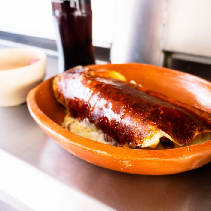 Quesadilla frita de maíz rellena de adobada bañada en consomé de res.
