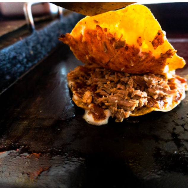 Costra de queso fundido rellena de birria de res.
