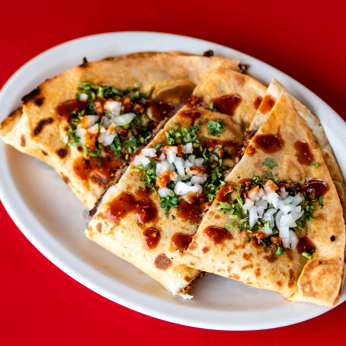 Quesadilla gigante (29 cm) de tortilla de harina rellena de birria de res con queso.