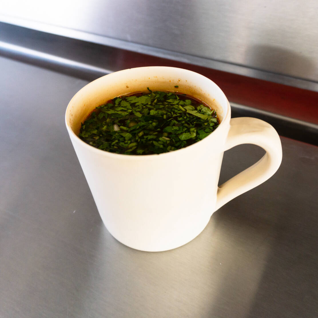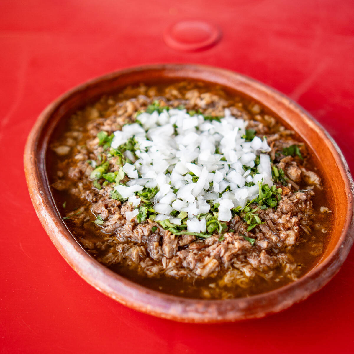 Aproximadamente 200 gramos de birria de res en consomé