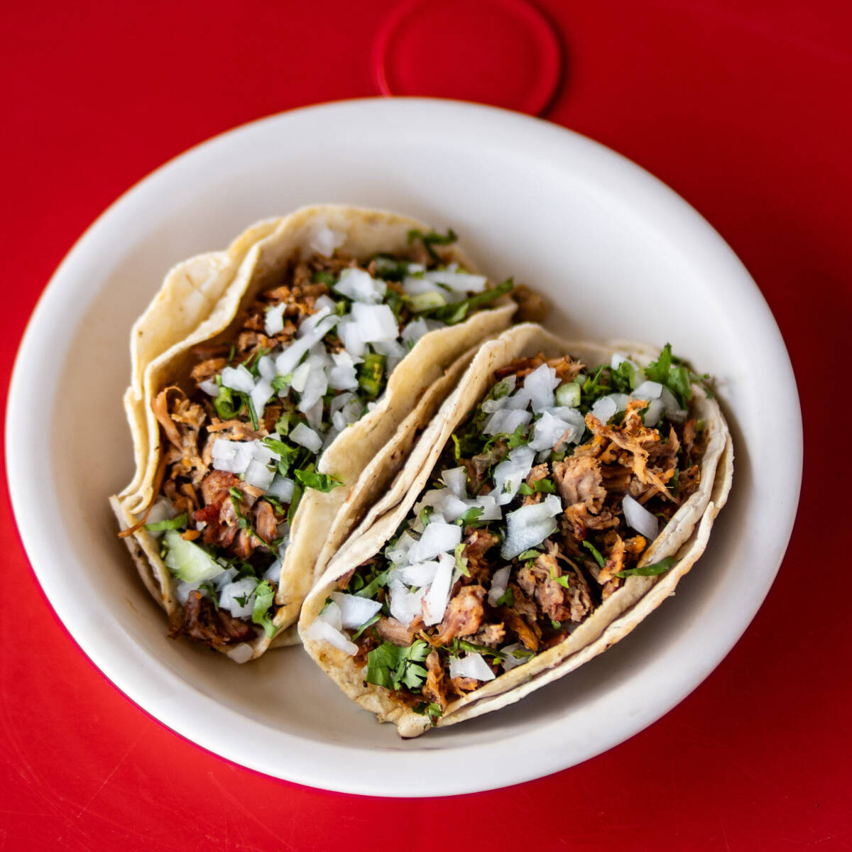 Taco de adobada en tortilla de maíz recién hecha, acompañado de salsas caseras.
