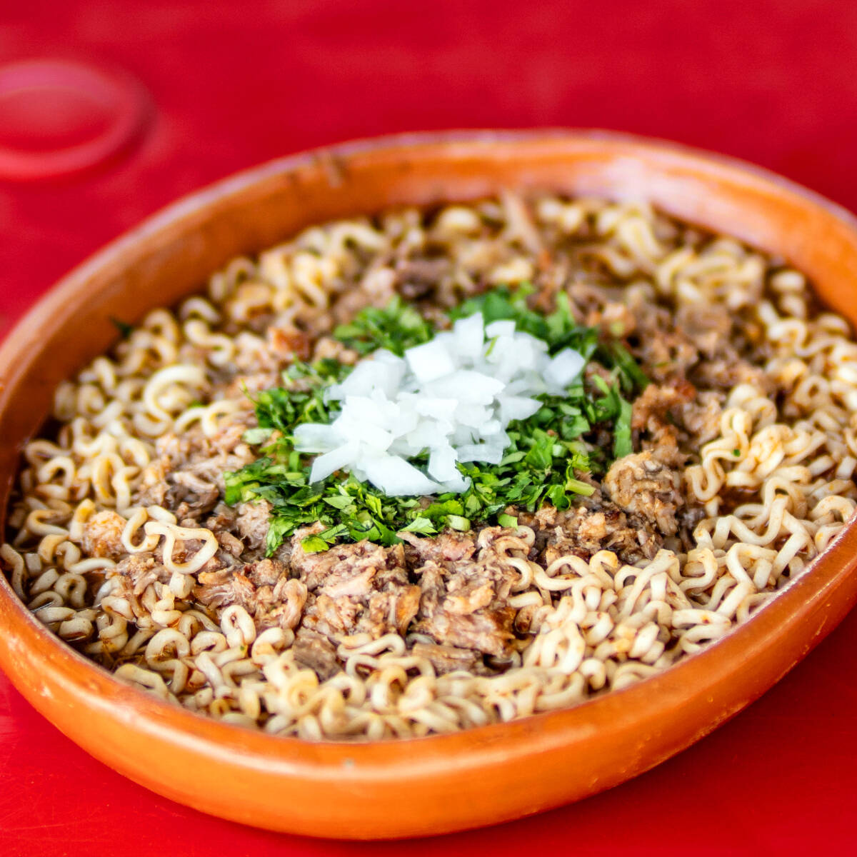 Ramen en caldo de res cocido con consomé de birria, único y lleno de sabor.