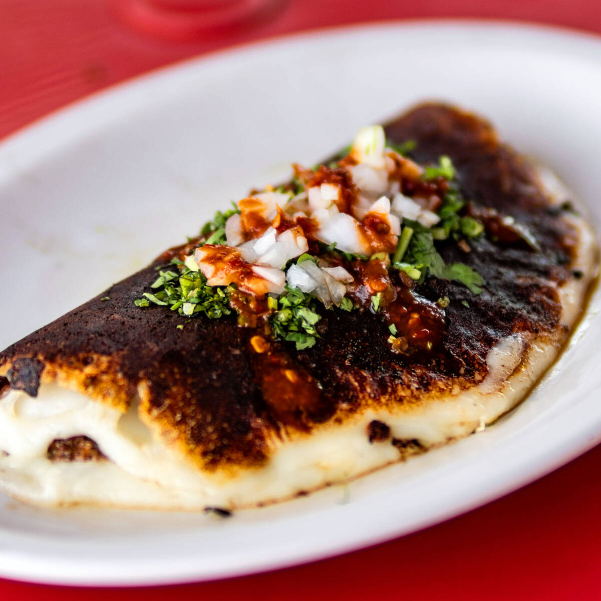 Quesadilla rellena de adobada en tortilla de maíz o harina, con queso fundido.