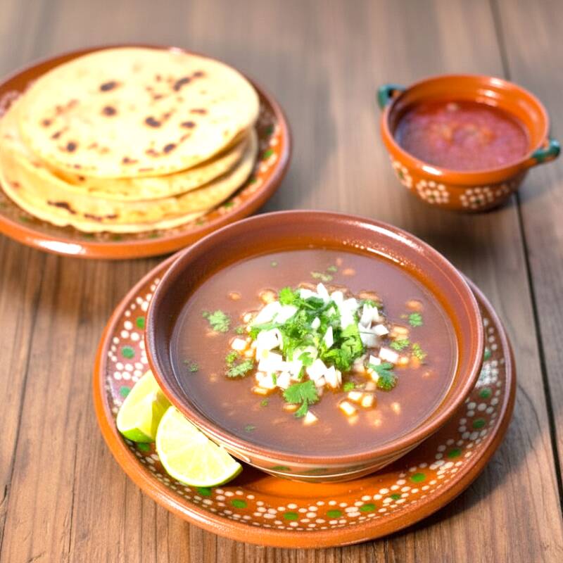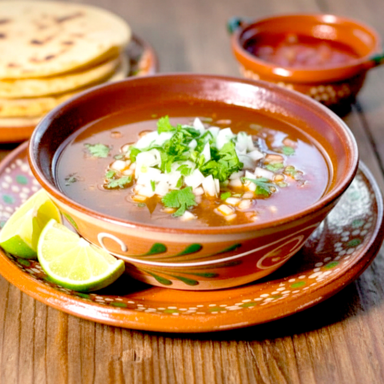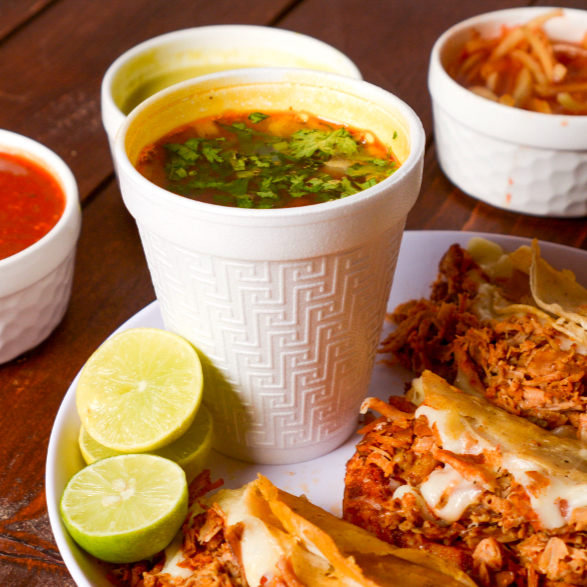 Disfruta un vaso de nuestro consomé de birria sin carne, lleno de sabor y aroma, acompañado de verduras frescas como cebolla, cilantro y limón, con una variedad de salsas para darle tu toque personal.