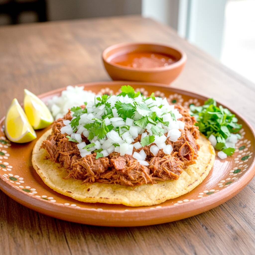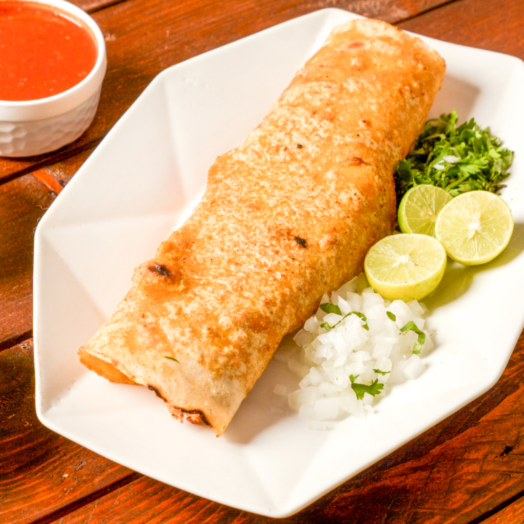 Una deliciosa tortilla dorada y crujiente con una generosa porción de nuestra birria estilo jalisco. perfecto para quienes disfrutan del sabor auténtico de la birria sin queso. acompáñalo con cebolla, cilantro, limones y nuestras salsas caseras. ¡pídelo y disfruta cada bocado!