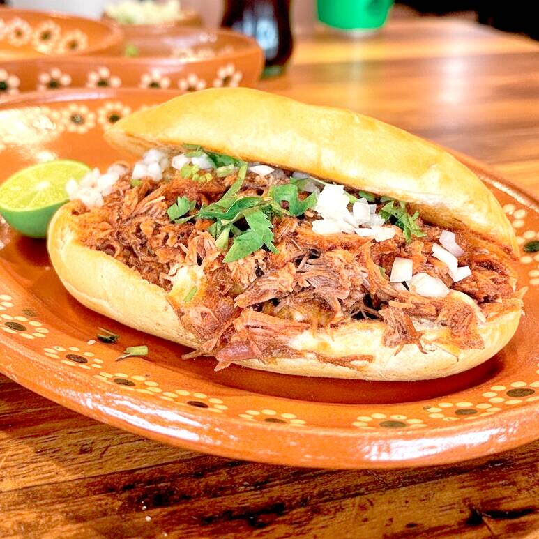 Torta de birria: pan suave relleno de nuestra birria estilo jalisco, desmenuzada y llena de sabor. acompañada de verduras frescas y salsas a tu gusto para disfrutarla al máximo.