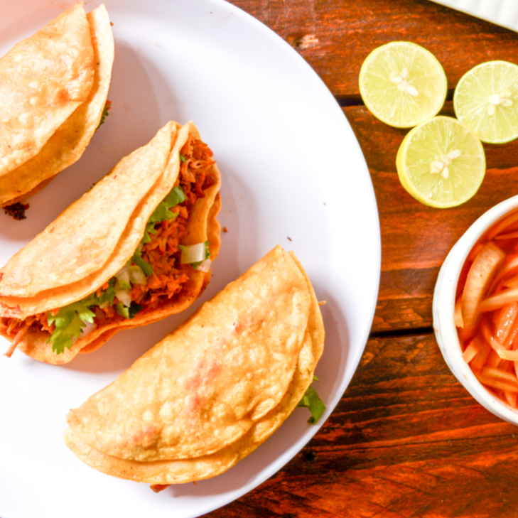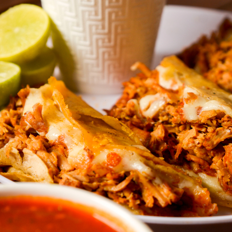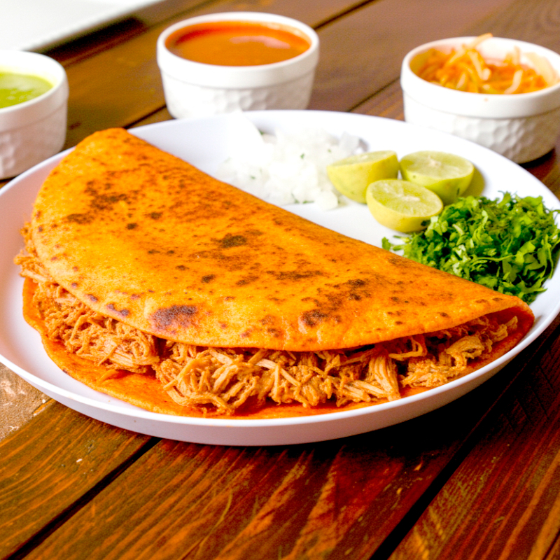 Quesibirria en tortilla de maíz, rellena de queso fundido y una generosa porción de nuestra auténtica birria estilo jalisco. acompáñala con verduras frescas y tu selección de salsas favoritas.