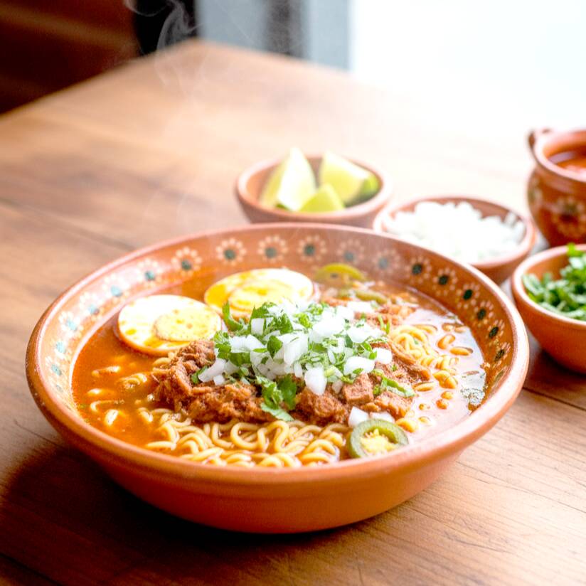 Una deliciosa fusión entre la birria mexicana y el ramen japonés. fideos suaves en nuestro consomé de birria lleno de sabor y especias, con ingredientes frescos que equilibran lo mejor de ambas cocinas.