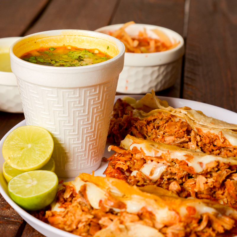 Orden de 3 quesibirrias de maíz, doradas o blandas, acompañadas de un vaso chico de nuestro consomé estilo jalisco. incluye verduras frescas y salsas a tu gusto para darle el toque perfecto.