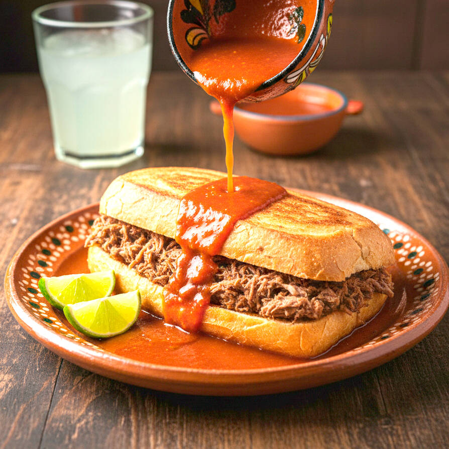 Torta ahogada al estilo guadalajara: birote crujiente relleno de nuestra birria de res estilo jalisco, sumergido en una deliciosa salsa de chile con el nivel de picante a tu gusto. ¡un clásico tapatío lleno de sabor!