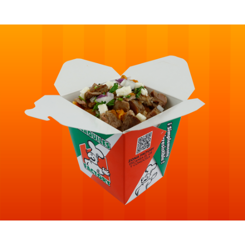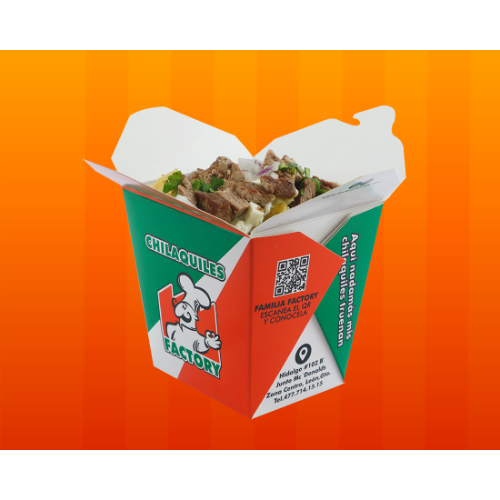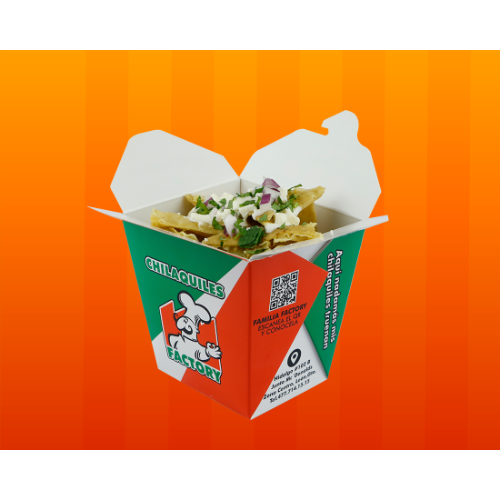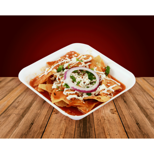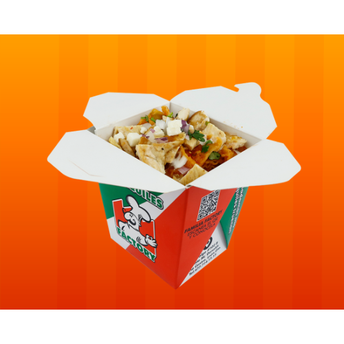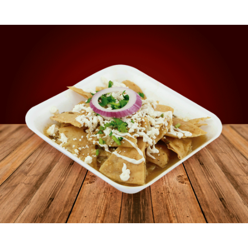 Deliciosos chilaquiles en presentación cajita con cebollita, cilantro, crema y queso fresco.