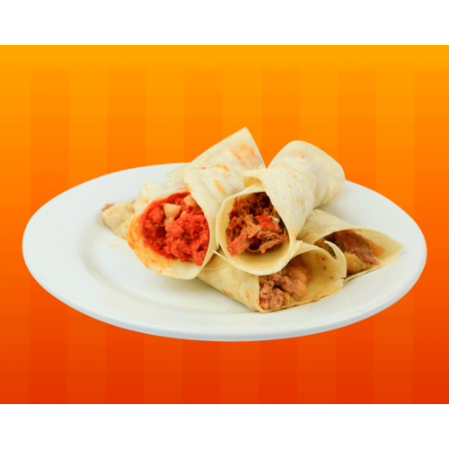Tortillas de harina de 20 cm rellenas de frijoles refritos y guisado a tu elección. ¡un bocado delicioso y lleno de sabor en cada mordisco!
