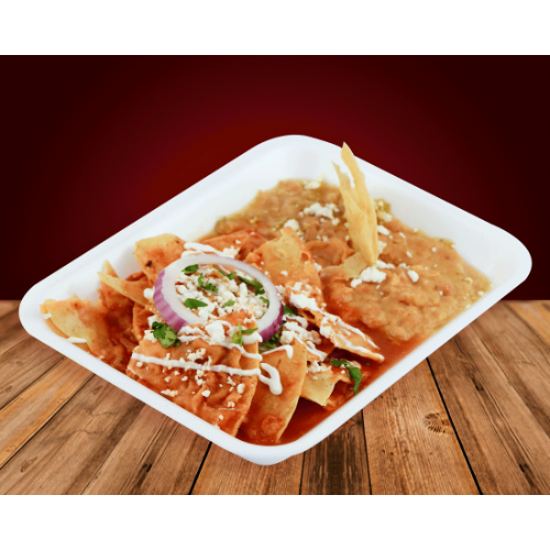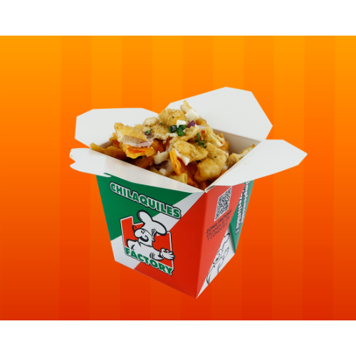 Deliciosos chilaquiles en presentación cajita con cebollita, cilantro, crema y queso fresco acompañados de la carne de tu preferencia.