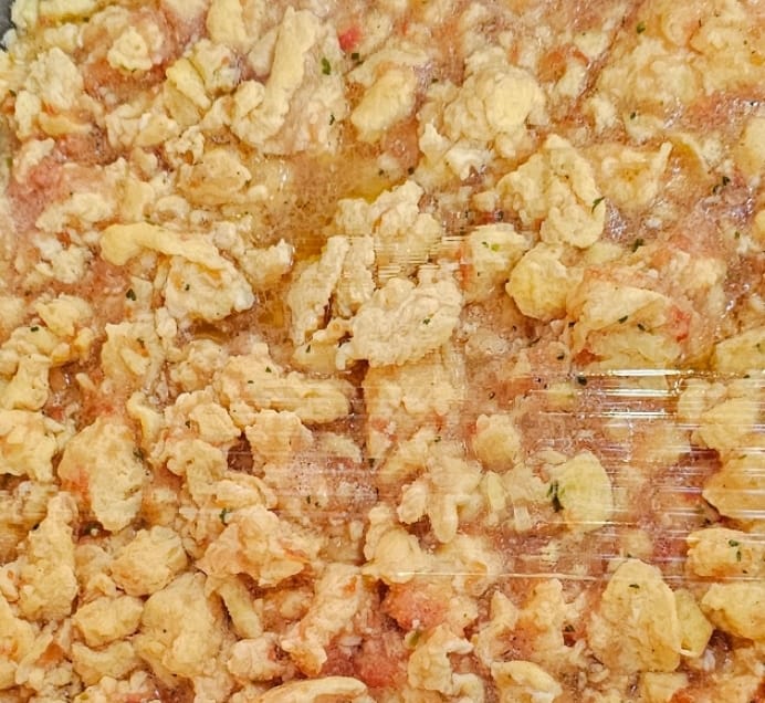 Tortilla de harina hecha a mano con huevo en salsa guisados.