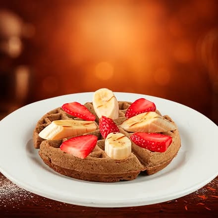 Un waffle preparado con nuestra receta de chocolate abuelita, acompañado con plátano y fresa bañado con chocolate o mermelada, o miel maple.