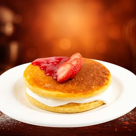 Dos hot cakes esponjosos con crema chantilly y mermelada de fresa.. Elaborados con nuestra deliciosa receta de la casa.