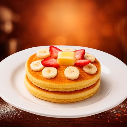 Dos hot cakes esponjosos preparados con nuestra receta de la casa, acompañado con plátano y fresa bañados en chocolate o mermelada, o miel maple.
