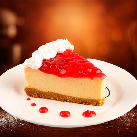Rebanada de Pay de queso cremoso con base de galleta y glase de fresa.