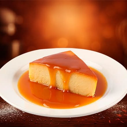 Rebanada de Flan napolitano cremoso con suave sabor a vainilla y toque de caramelo.