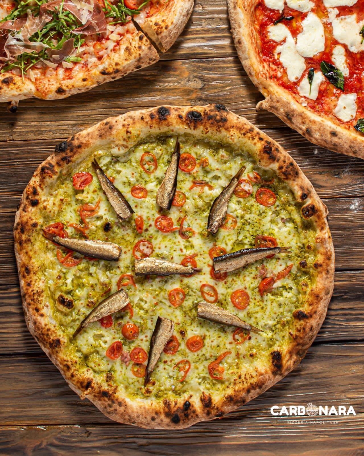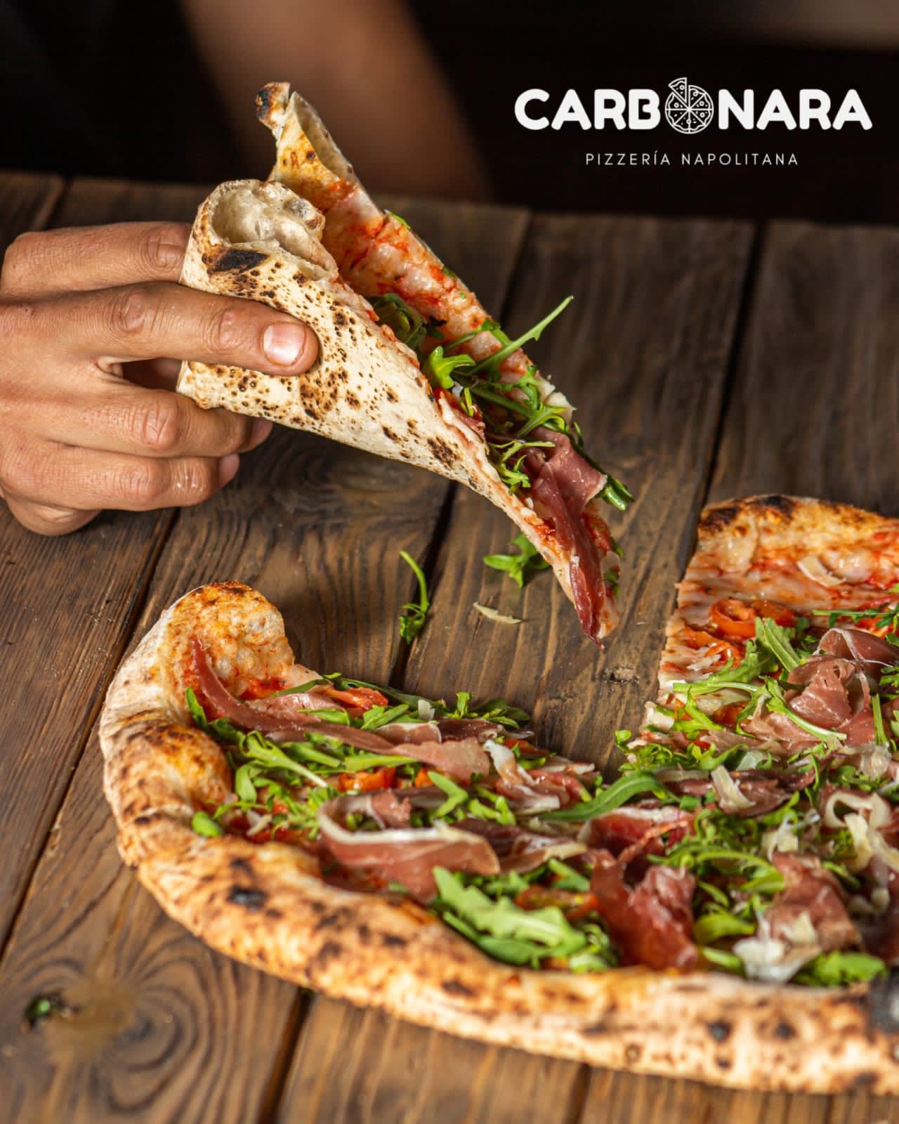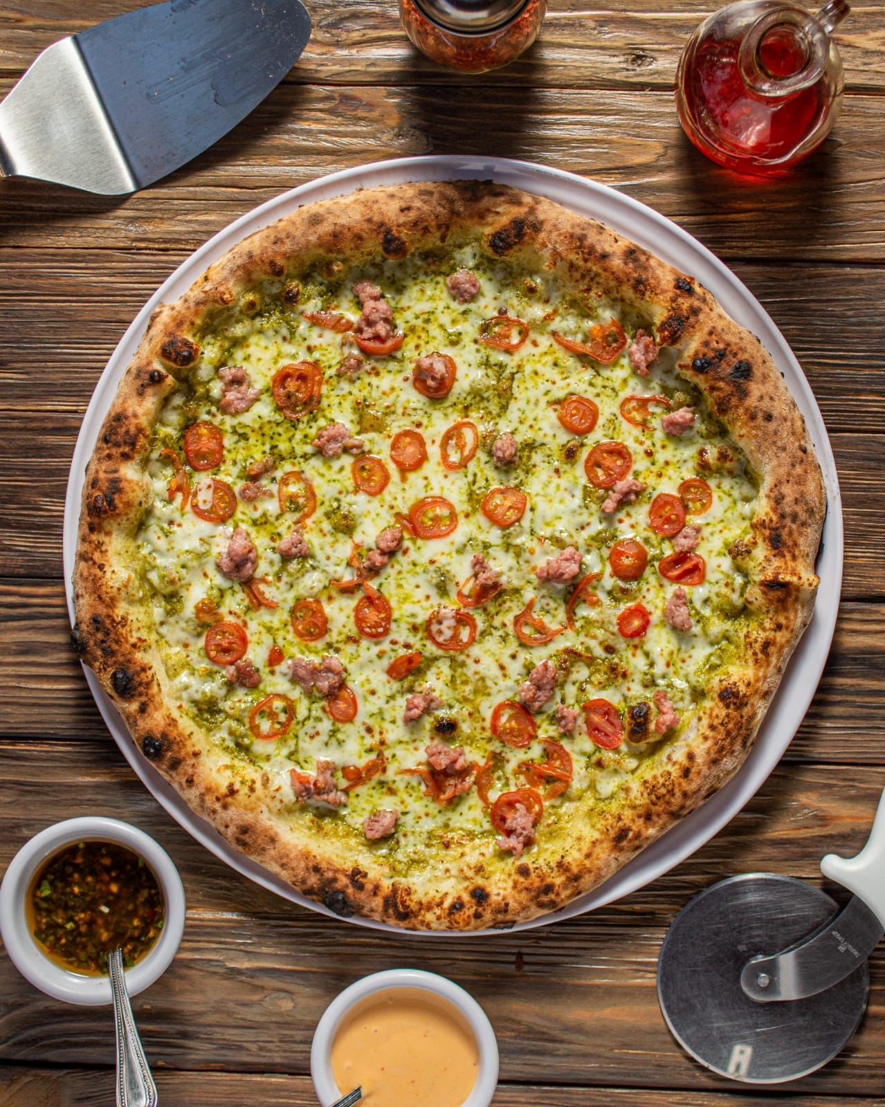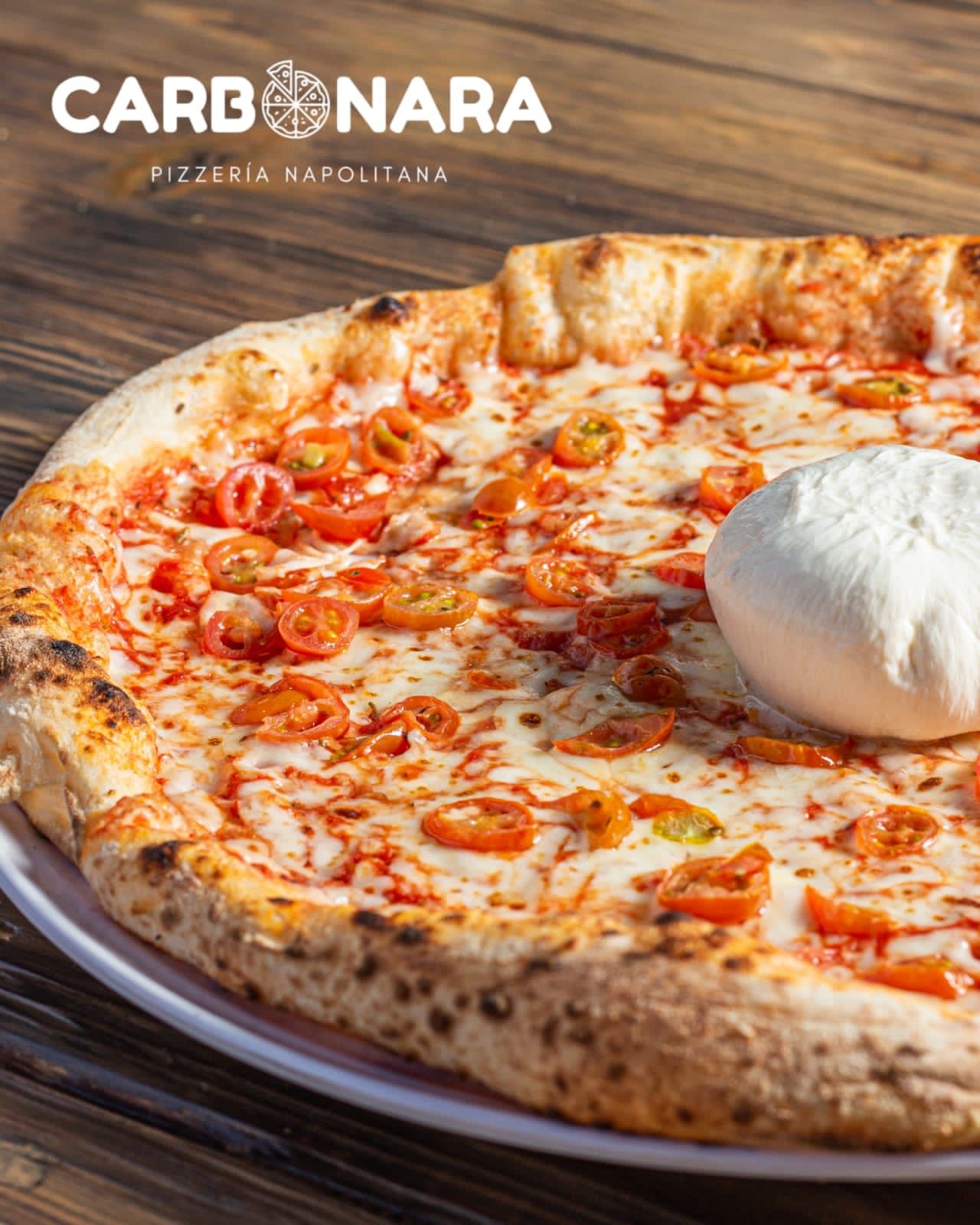 Pomodoro italiano, mozzarella, arrachera, queso azul, cebolla morada, morrón asado.