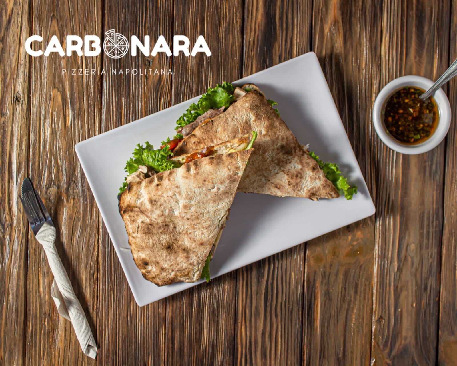Pan de la casa acompañado de pollo, lechuga italiana, aderezo de la casa, pimiento morrón asado, cebolla morada y jitomate.