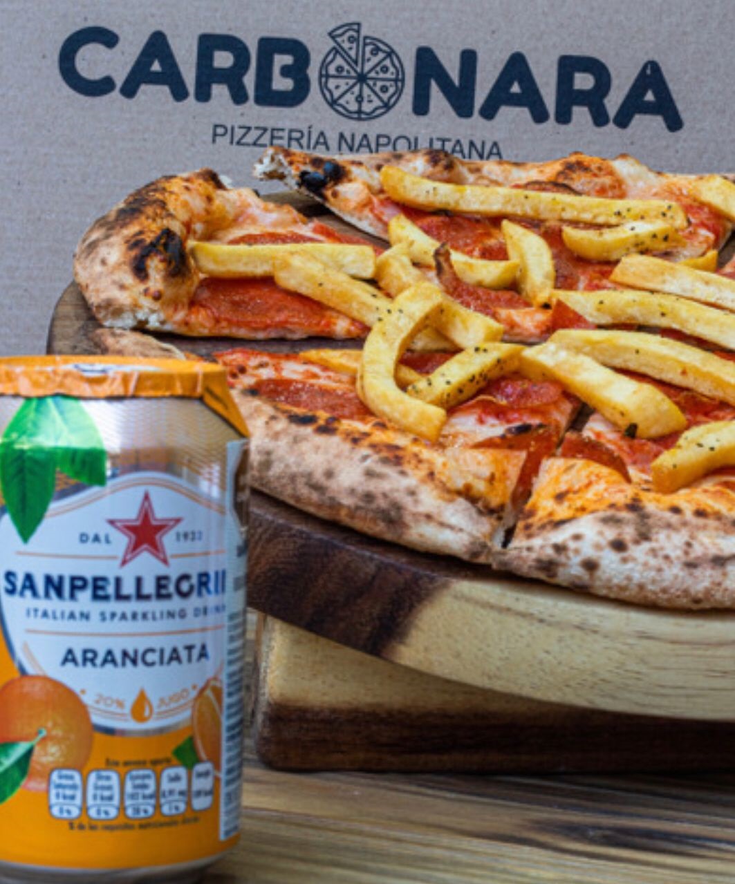 Pomodoro italiano, mozzarella, pepperoni, papas a la francesa.