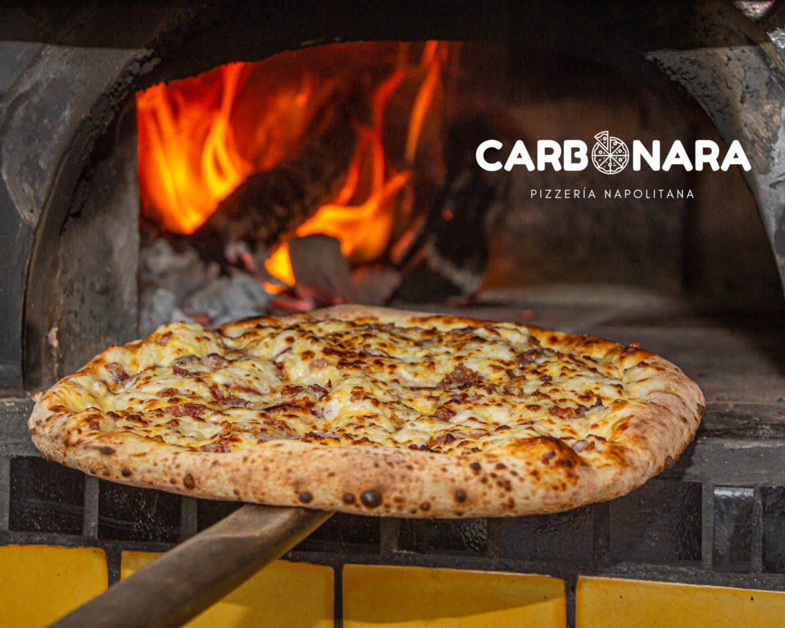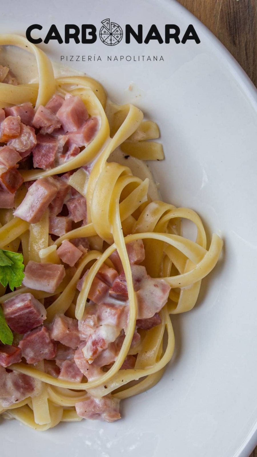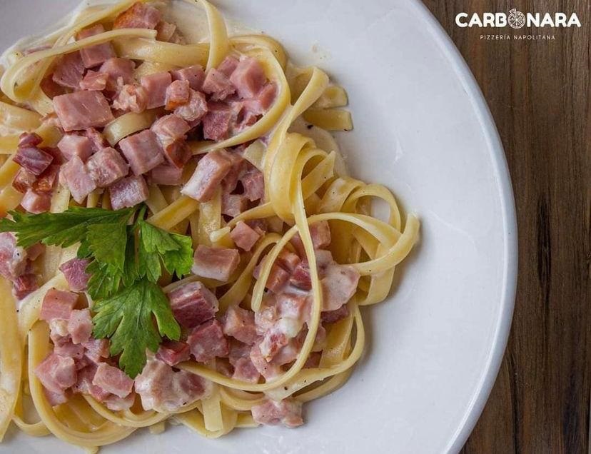 Carbonara, crema de la casa, acompañada de tocino y jamón.